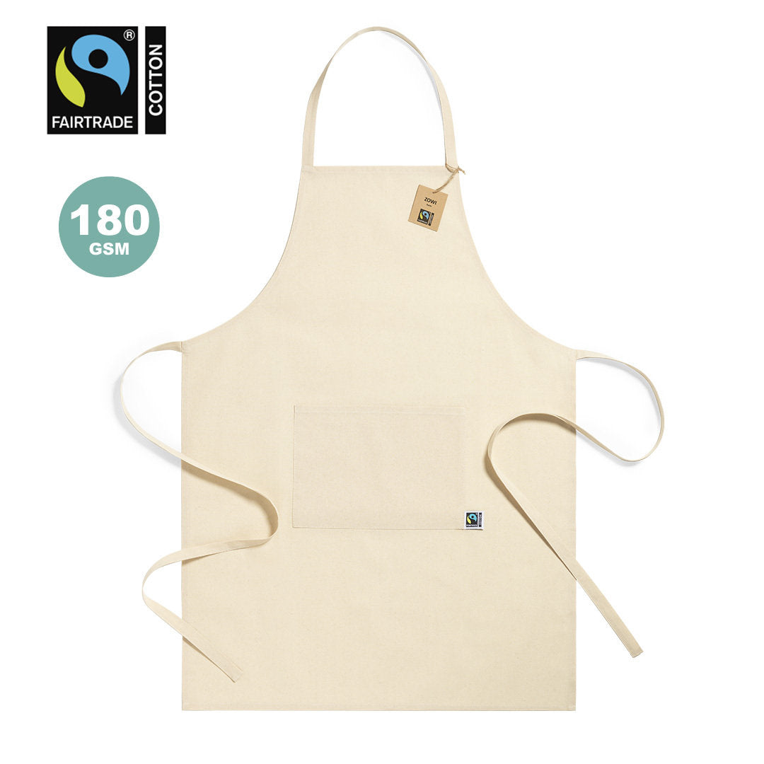 Nature line apron, made of cotton 180g/m2 in a natural tone. With Fairtrade certification, an alternative to the conventional trade system that pursues the development of peoples and the fight against poverty. With front pocket and drawstring, fitting below the knee. Including Fairtrade label and hangtag in recycled cardboard.