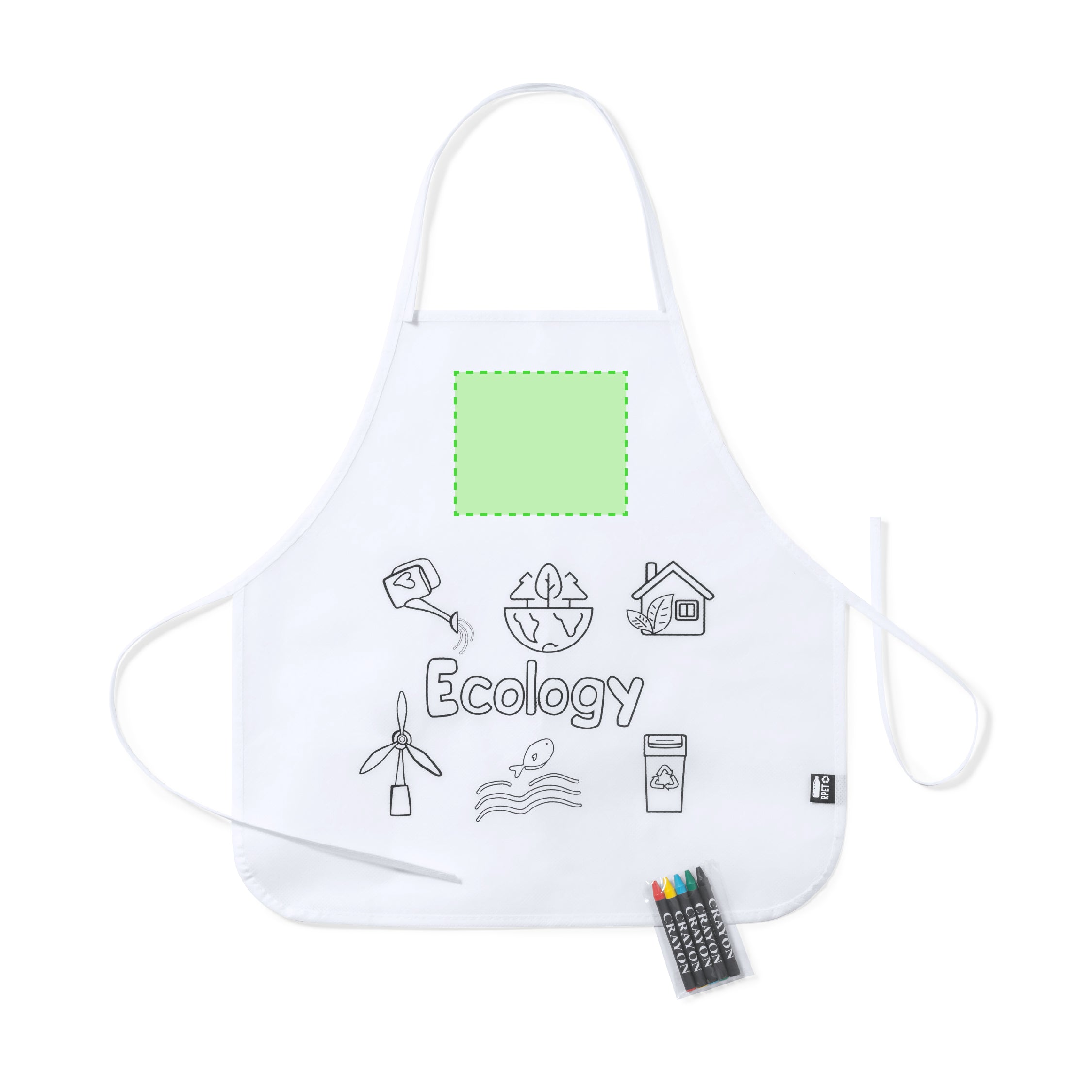 Apron made of non-woven RPET in white, specially designed for coloring with crayons. Including 5 crayons in different colors. With adjustable neck and waist straps. Outside label with the RPET distinctive.RPET material is made from recycled plastic, to encourage the reuse of plastic waste and help the sustainability of the planet.