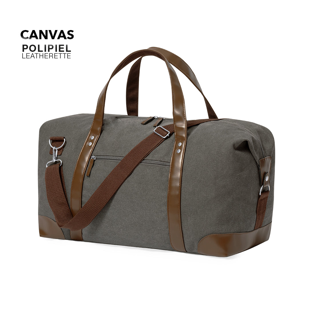 Stylish bag in durable 475g/m2 grey canvas, with durable and functional leatherette handles all around the bag and reinforced corners. Main compartment with zipper closure matching the handles and adjustable shoulder strap with carabiner fastening. Including easy-access outer pocket.Presented in an individual recycled bag.