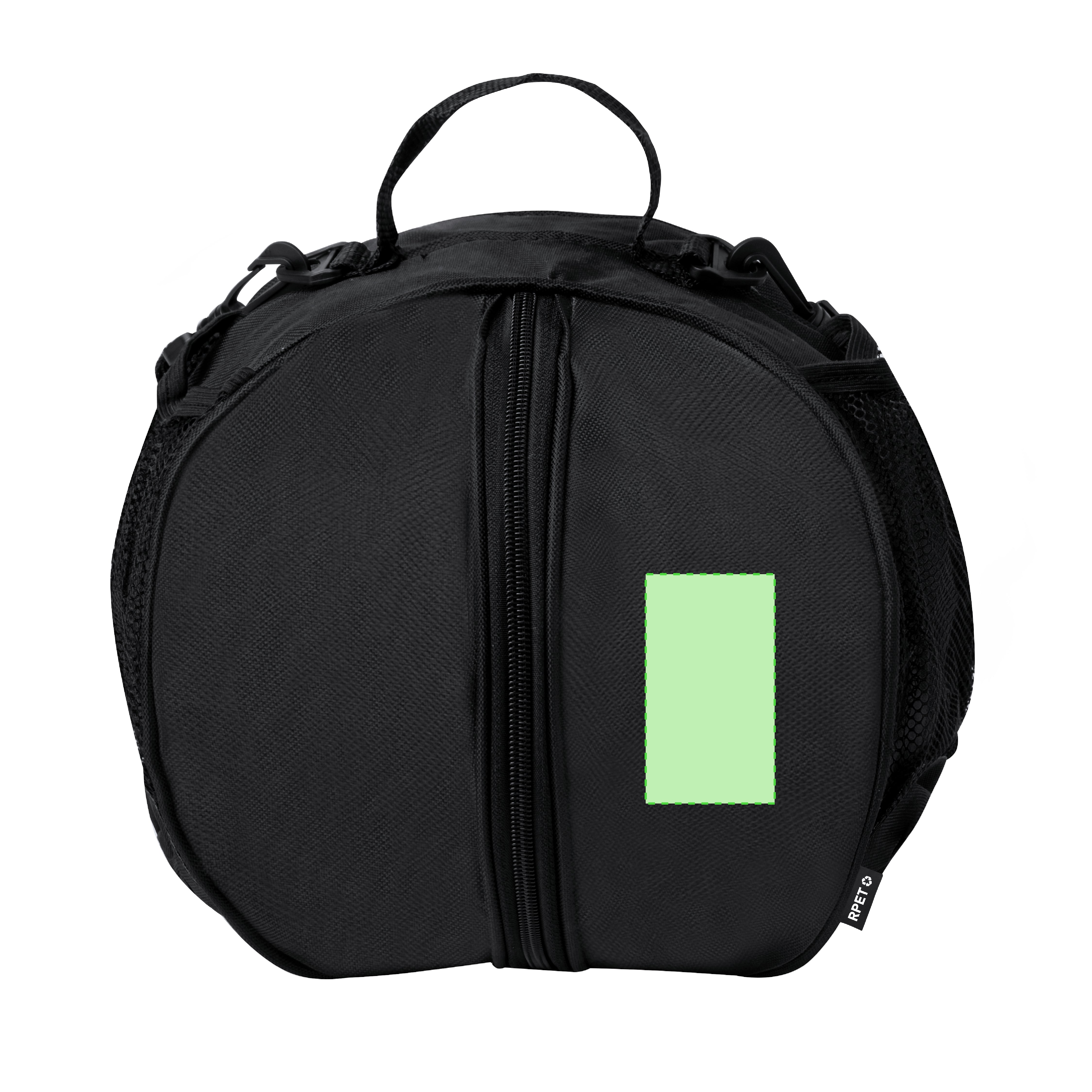 Useful bag for balls, made in RPET. With a central compartment for storing a ball and with zipper closure. Very easy to carry using the handles or the shoulder strap. It also has two side mesh pockets and an RPET label.RPET material is made from recycled plastic, thus promoting the reuse of plastic waste and helping the sustainability of the planet.