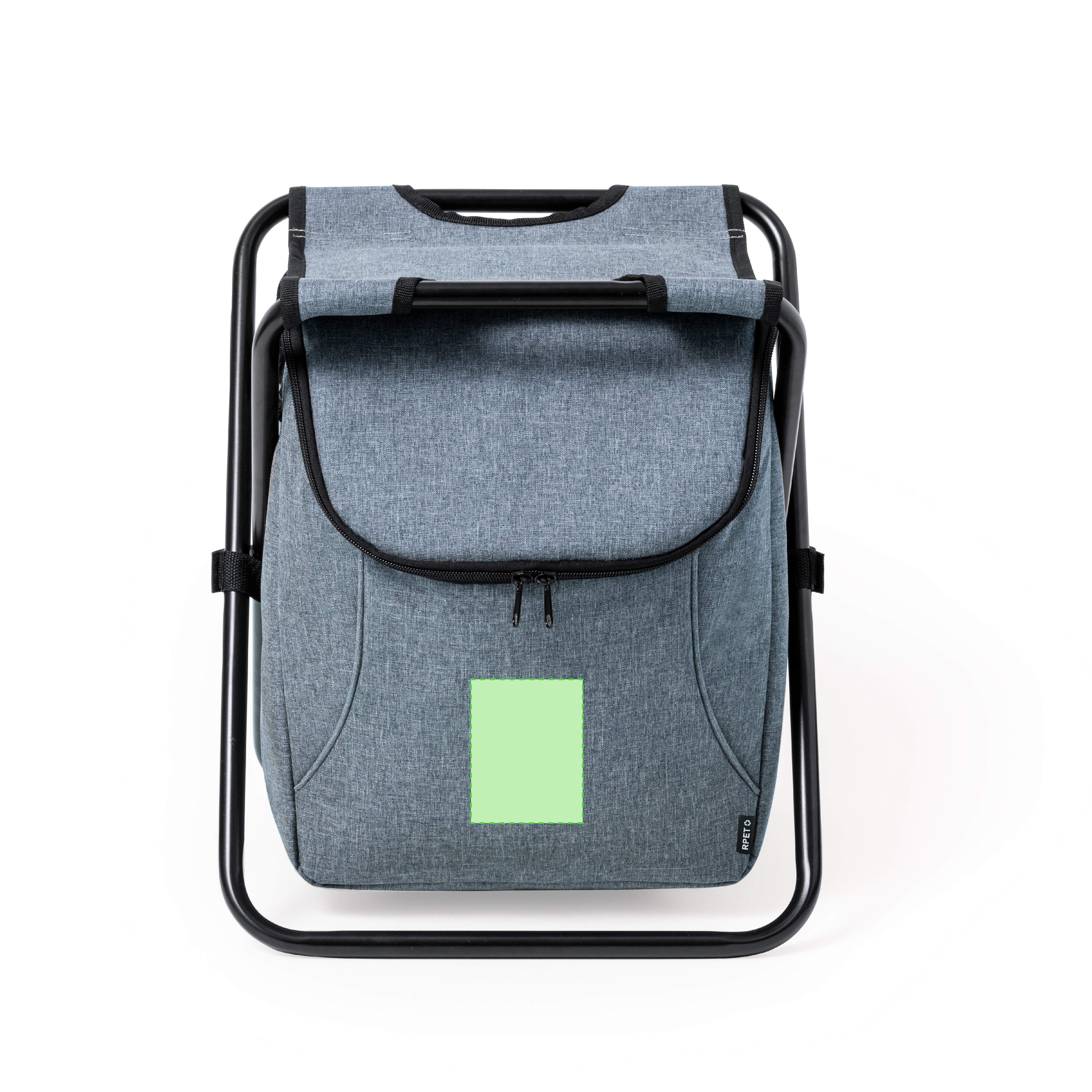 Folding chair with Aluminium body and cooler bag integrated in the seat. Made in RPET 600D, with reinforced seams, zip closure and practical shoulder handles for transport, which can be kept in the dedicated pocket. With nylon reinforcement strip on the legs and PEVA isothermal interior. Presented in an individual bag.RPET material is made from recycled plastic, thus promoting the reuse of plastic waste and helping the sustainability of the planet.