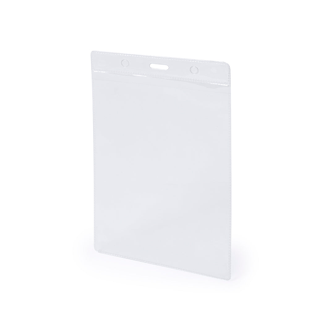 Vertical PVC identifier. Practical badge holder with reinforced top and perforations for both central and side fastening.
