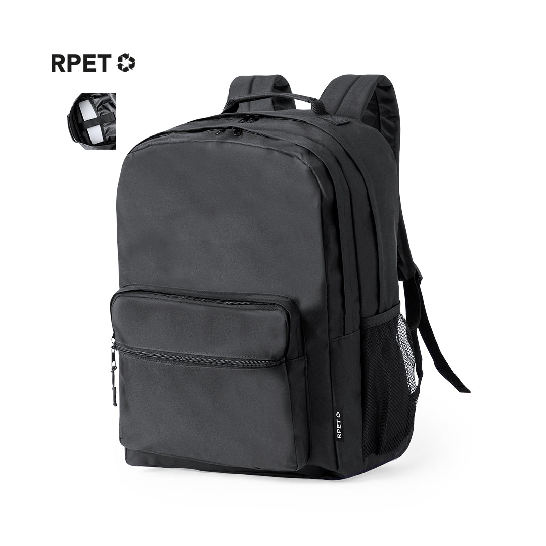 Backpack made of durable 600D RPET. It features two centre pockets with double pull zip closure and two front pockets for convenient access. Inside, it has a padded pocket designed to fit a laptop up to 15 inches. The back and shoulder straps are padded and adjustable, incorporating breathable fabric. It also features a top strap and side mesh pocket. RPET badge on label. Presented in an individual Recycled bag. RPET material is made from recycled plastic to encourage the reuse of plastic waste and help the sustainability of the planet.