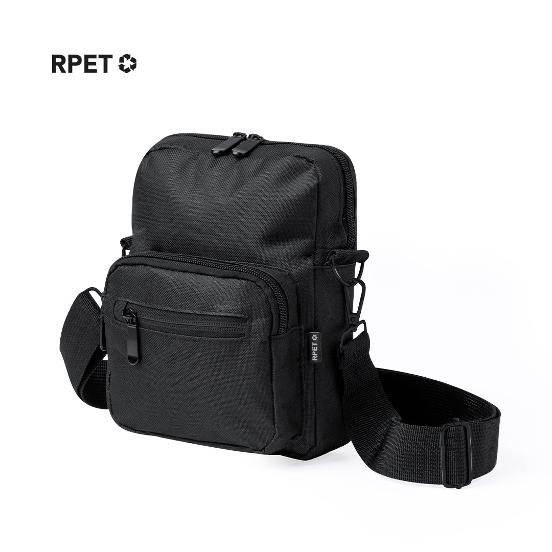 Shoulder bag made of RPET 600D polyester, with a central zipped pocket and double puller, and two front compartments with quick access and zipped closure. Equipped with an adjustable strap for comfort and a RPET label. Presented individually in a recycled bag.
