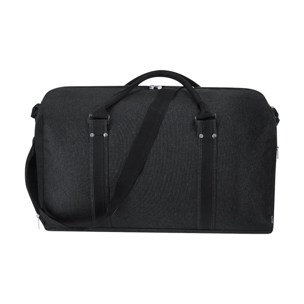 Bag made of RPET 600D polyester. Features three functional compartments: a large main compartment with zipper closure, a side pocket with zipper closure, and a pocket at the base with double zipper closure ideal for shoes. Includes adjustable long strap, reinforced handles with metal studs, and elegant silver details.RPET material is made from recycled plastic to promote the reuse of plastic waste and help the sustainability of the planet.