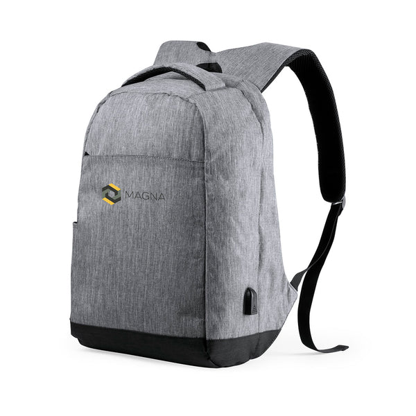 Anti-theft backpack in durable 300D polyester. High quality, cut and scratch resistant fabric, with anti-theft pocket on the back to store valuables. Zipped main compartment equipped with powerbank connection - not included - and two separate, padded interior compartments for laptops up to 15" and tablet up to 10", plus additional inside pockets. Features an outside front pocket with zip closure. Comfortable to carry using the padded back and ergonomic, adjustable shoulder straps. With trolley fitting accessory.