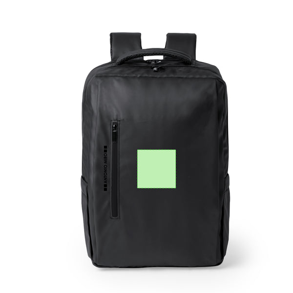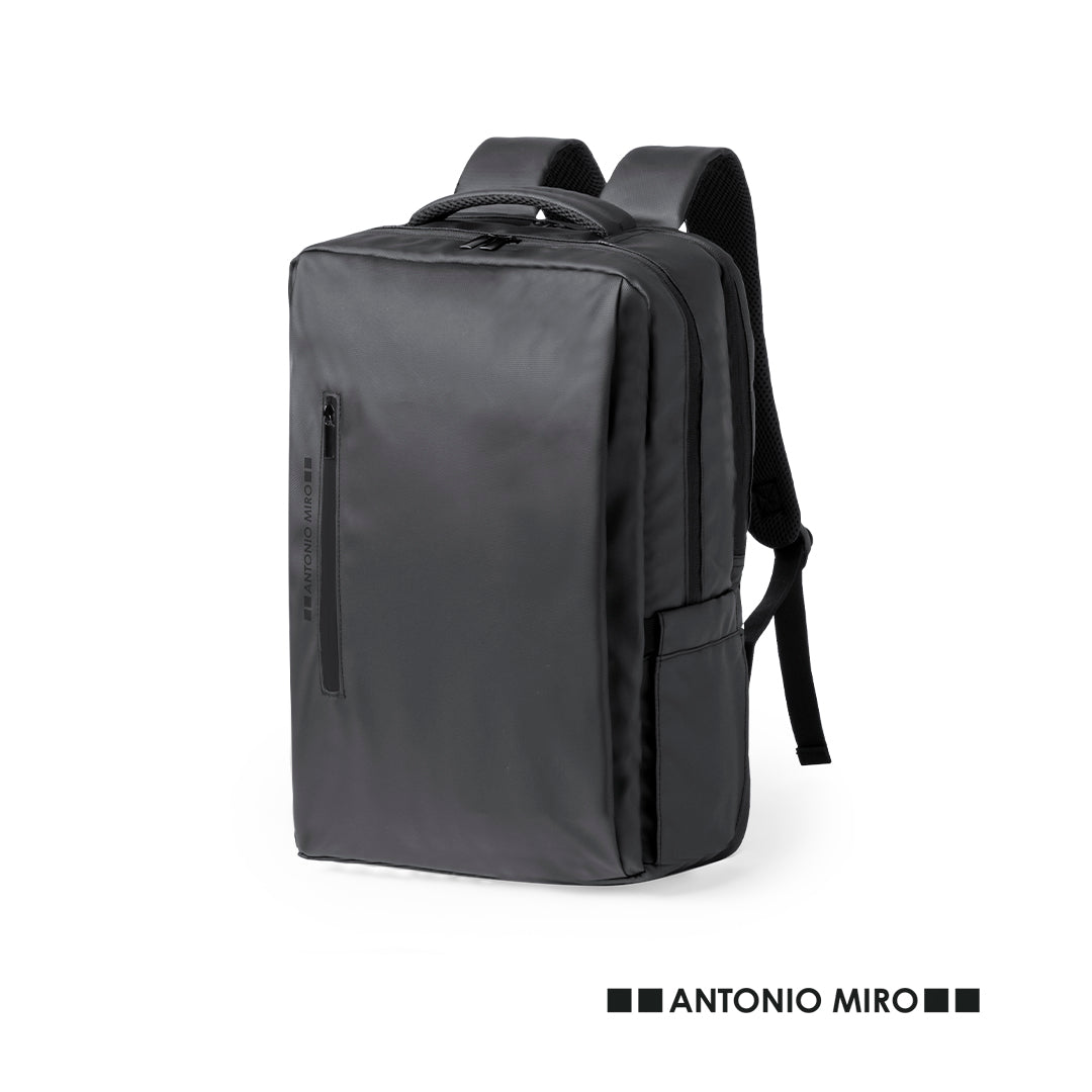 Premium quality Antonio Miró backpack in resistant leatherette with a sober design in black. With double zipper closure, front pocket and reinforced padded handle. With ergonomic padding on the back and shoulder straps, it includes a padded interior compartment for a laptop up to 15 inches and for tablets up to 10 inches. In addition, with an anti-theft pocket with zipper closure on the back. Interior covers for pens and smartphone. With brand logo on the front.