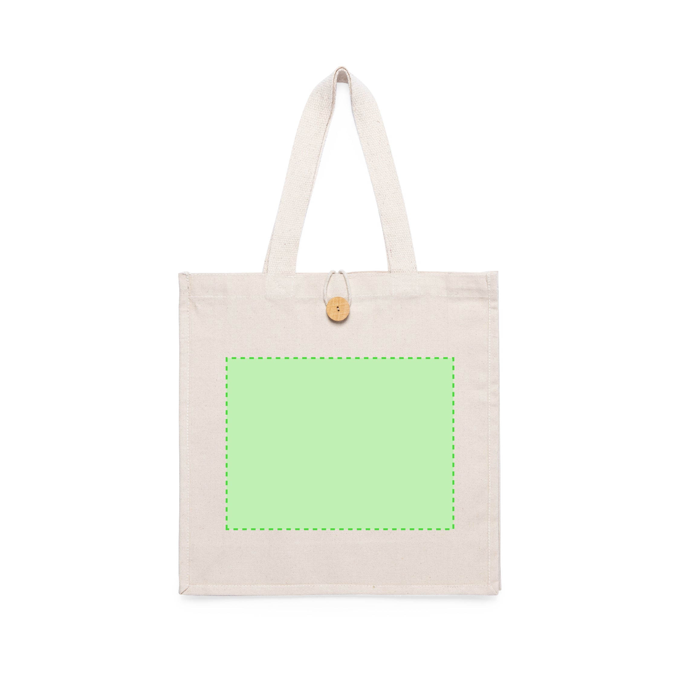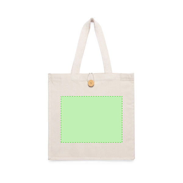 Bag made in cotton, natural finish and extra weight of 310g/m2. With original button closure, stitched finish and gusset. Extra wide and reinforced medium handles (60 x 3,5 cm). Resistance up to 10 kg weight.