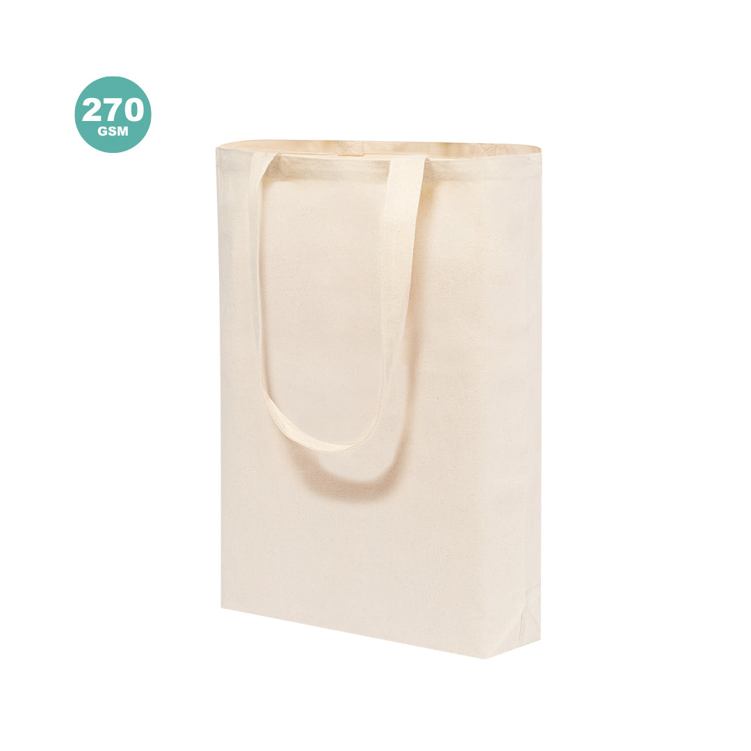Canvas bag 270g/m2. In natural colour, with strong stitched finish, 70cm length reinforced handles and gusset. Resistance up to 10 kg.