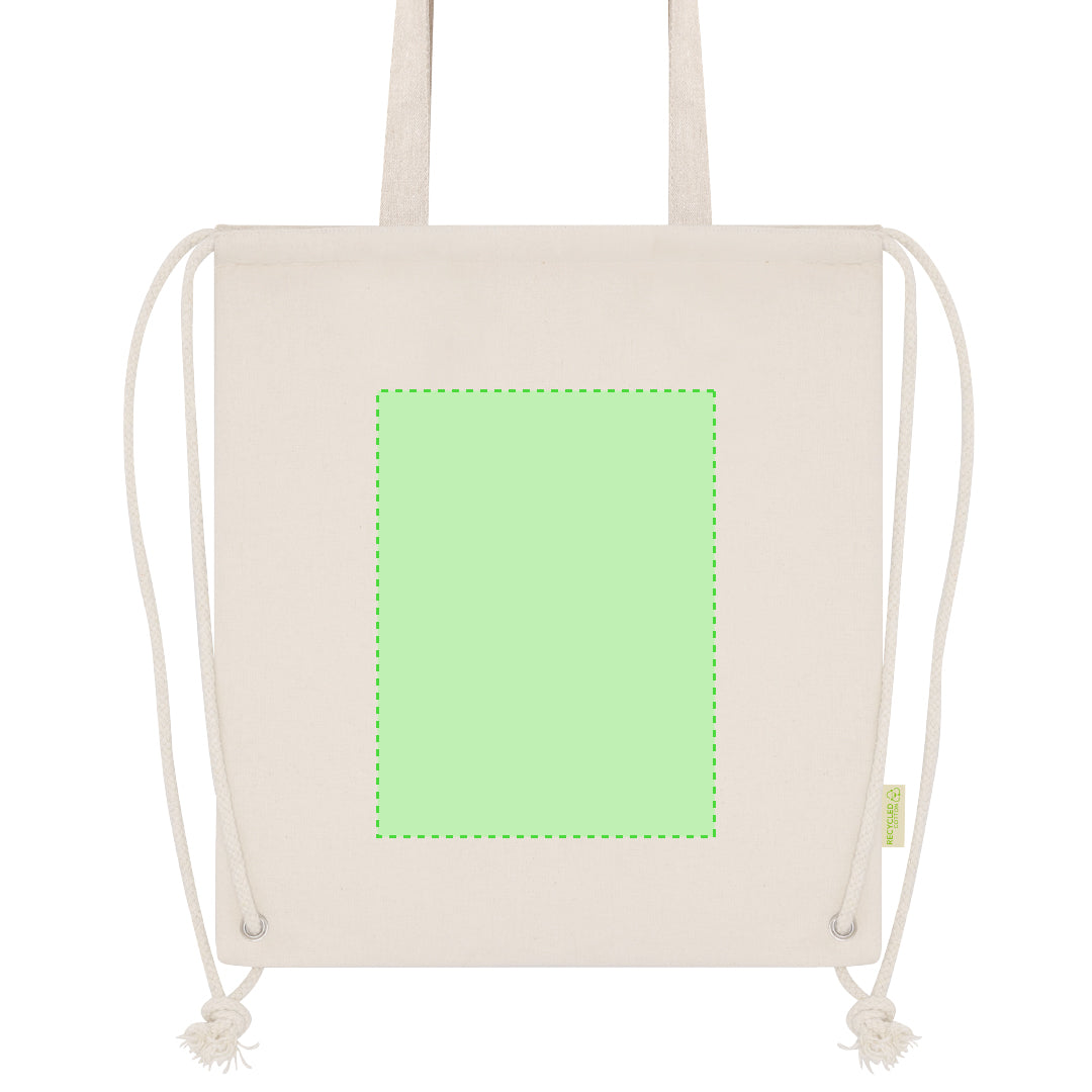 Cooler drawstring bag made of 140g/m2 recycled cotton. With aluminum interior. With matching reinforced handles. Maximum resistance of 9 kg. Includes a recycled cotton label.