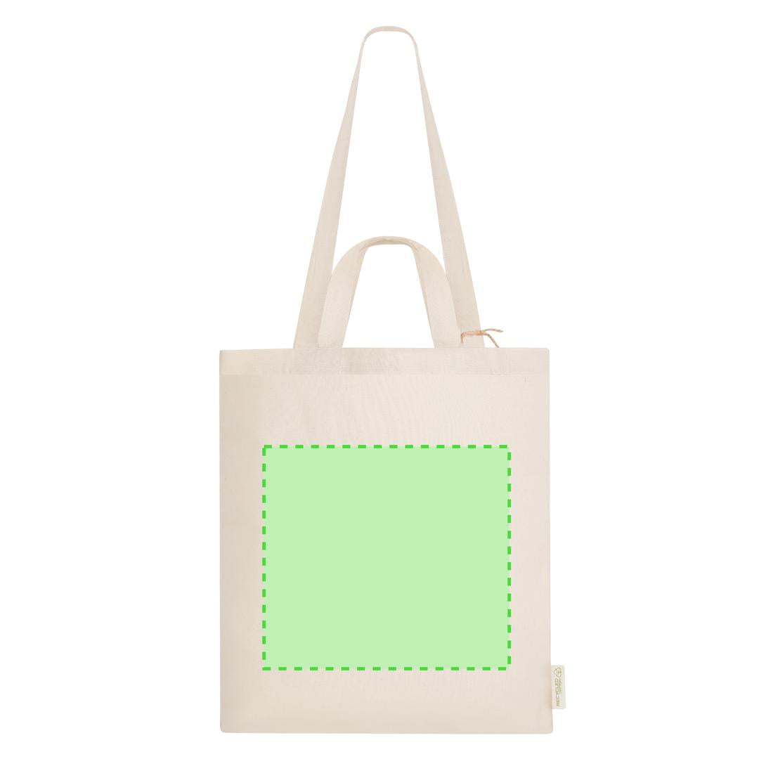Bag with gusset made mainly of recycled cotton 140g/m2. It has double handles: long handles of 70 x 2.5 cm and short handles of 30 x 2.5 cm. Includes recycled cotton label. Resistance up to 6 kg.