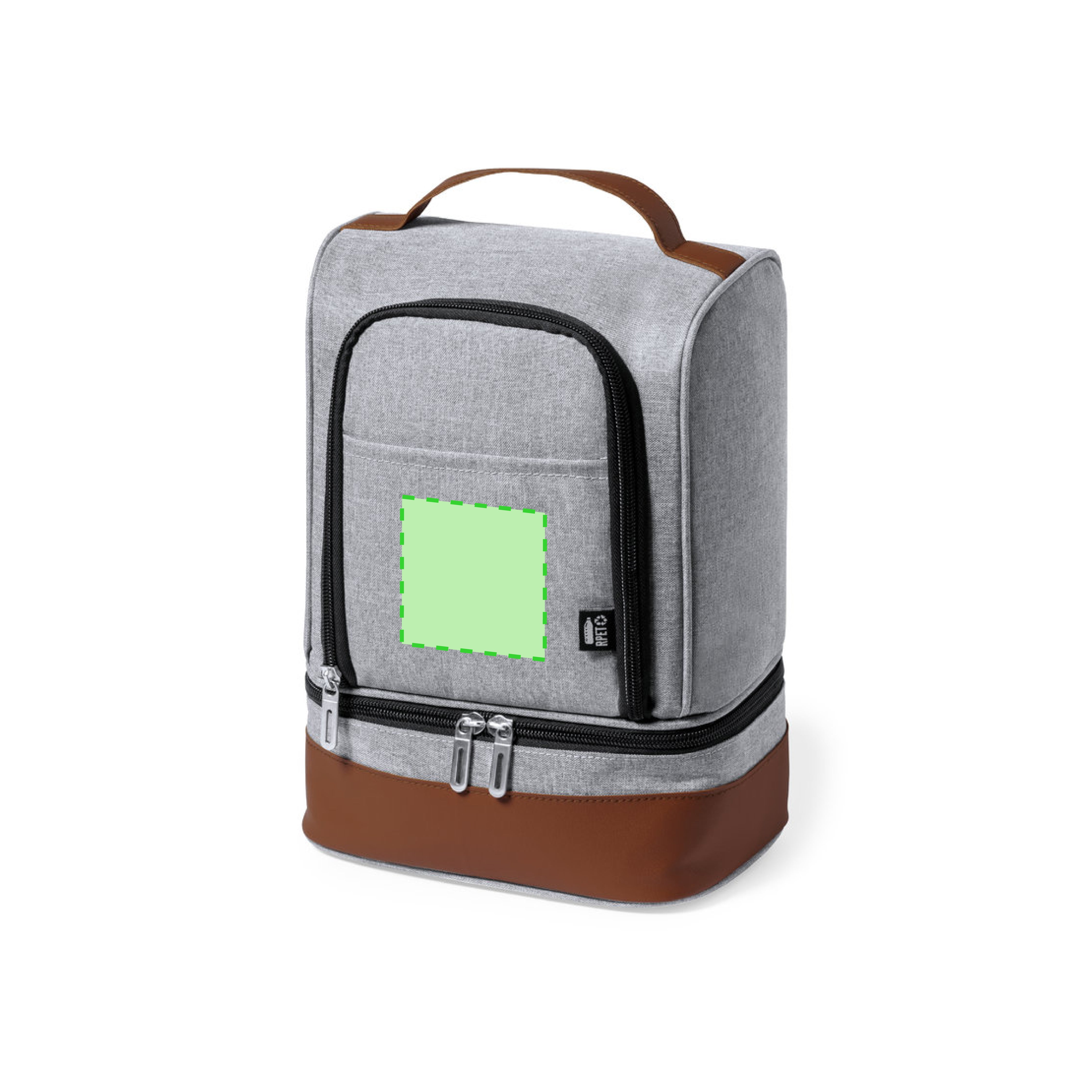 Cooler bag made of resistant 600D RPET. Grey finish, with base and carrying handle in brown PU leather. 2 independent compartments, with zip closure and metal handles. PEVA isothermal inside and outside label with the RPET distinctive.RPET material is made from recycled plastic, to encourage the reuse of plastic waste and help the sustainability of the planet.