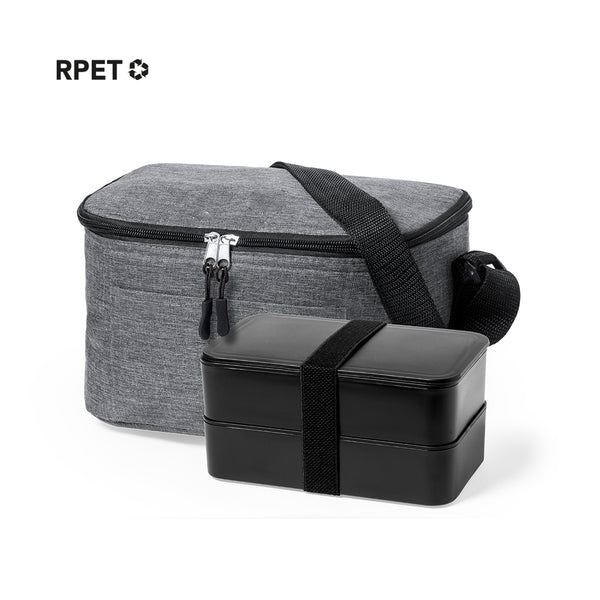 Cooler made of durable 600D RPET polyester with an attractive melange effect. The main compartment features a zip closure with Aluminium lining. It also features a handy exterior pocket and an adjustable shoulder strap, with RPET label. Including a lunch box with two 700 ml compartments and cutlery made in black recycled PP. Presented individually in a recycled bag.RPET material is made from recycled plastic, thus promoting the reuse of plastic waste and helping the sustainability of the planet.