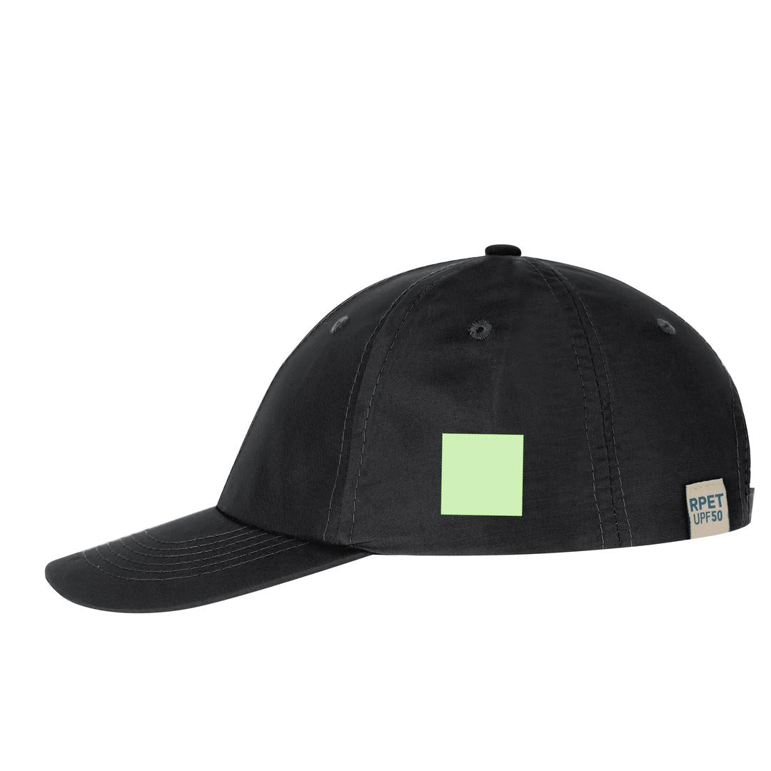 Sport cap with 5 panels in RPET polyester with UV50 protection. Adjustable metal buckle closure and embroidered ventilation holes. With RPET and UV logo on the label.RPET material is made from recycled plastic, promoting the reuse of plastic waste and helping the sustainability of the planet.