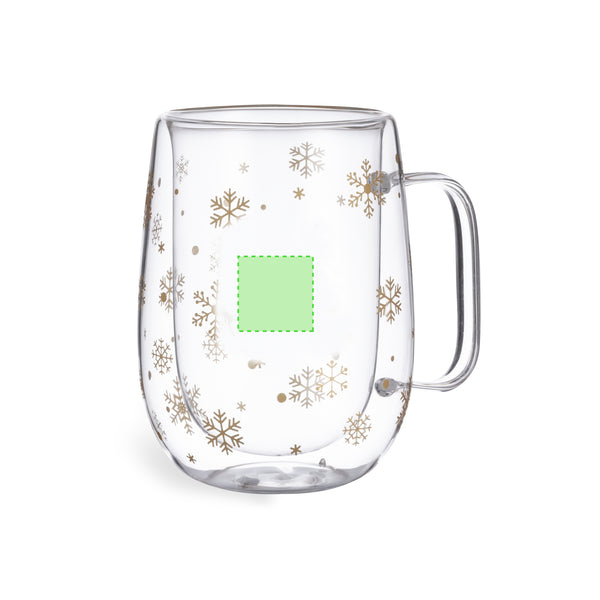 400 ml double wall thermal mug. With original snowflake design and special branding area at the front. Made of borosilicate glass, which offers exceptional strength and durability, extending its lifespan and making it reusable countless times.Presented in a black design box with a golden illustration.