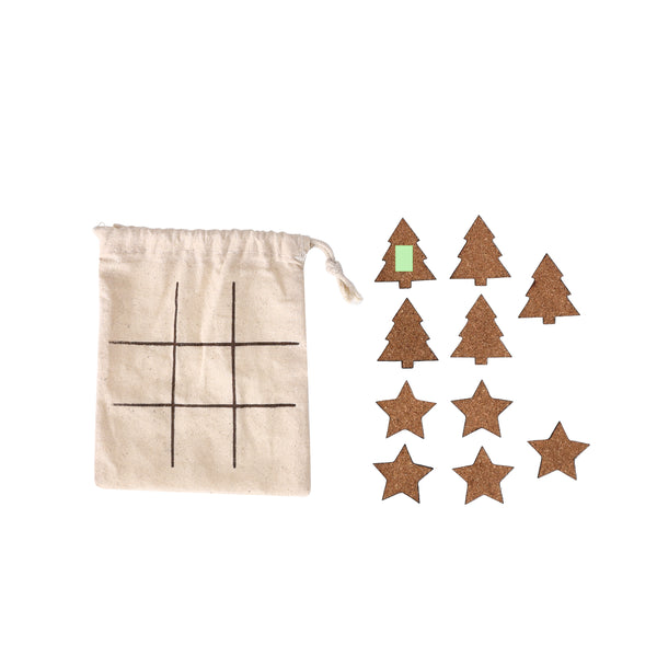 Tic-tac-toe game made of natural cork. Including 5 tree-shaped tokens and 5 star-shaped tokens. Presented in a cotton bag with drawstring closure to be used as game board.Made with plant-based elements to promote the use of natural raw materials and reduce polluting emissions.