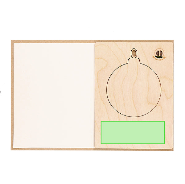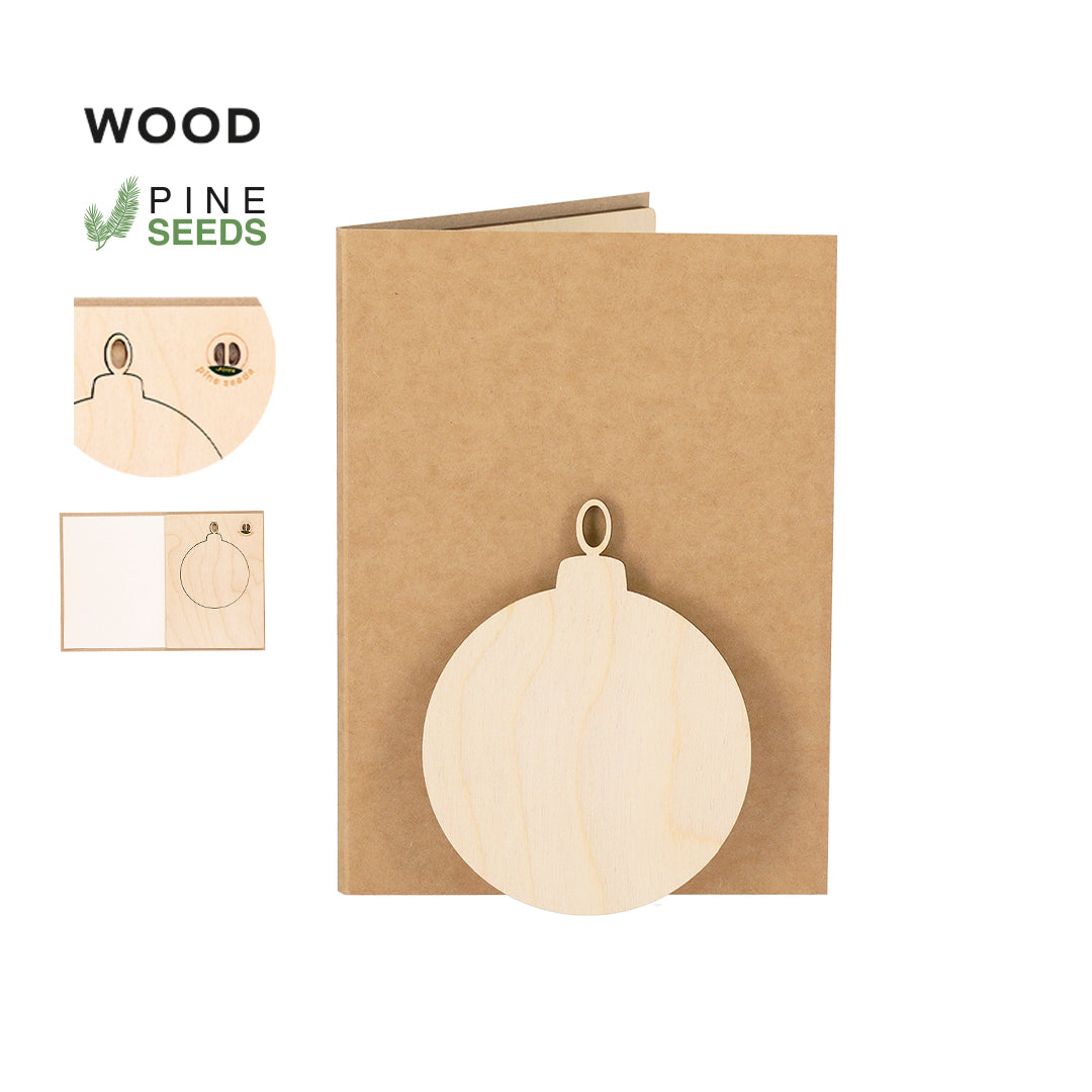 Sustainable and original Christmas card set with pine seeds, an environmentally friendly and surprising gift. Contents:Postcard made of Kraft paper. Christmas Ball made of natural wood with die-cut inside. Pine seed capsule integrated inside.Made with plant-based elements to promote the use of natural raw materials and reduce polluting emissions.