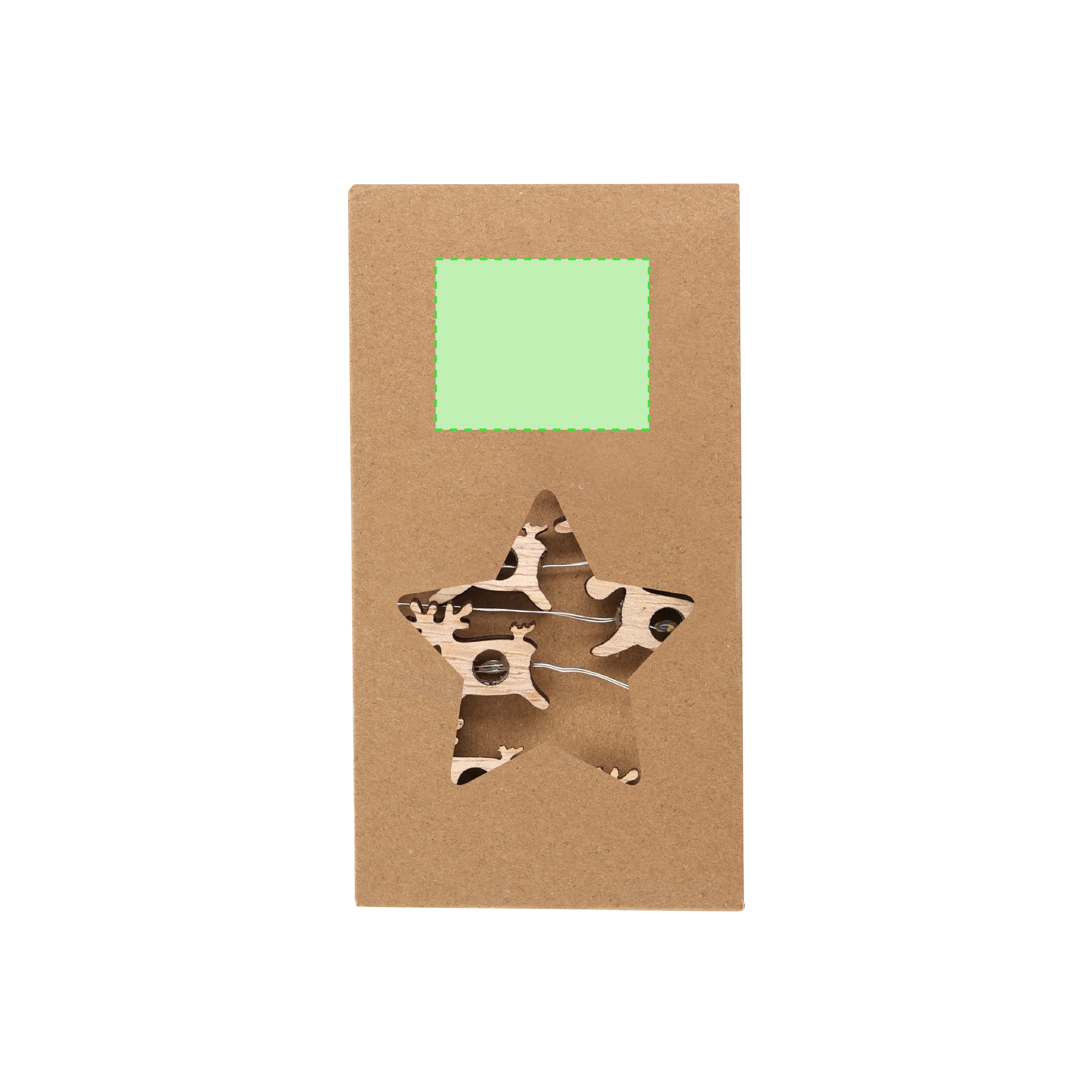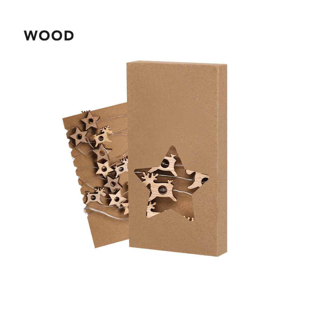 Illuminated garland made from natural wood. An original decoration accessory with ornaments in natural materials, combining star and reindeer shapes. With 20 warm LEDs. Battery power supply (2xAA not included). Presented in an attractive kraft box with star shaped die cut.Made with plant-based elements to promote the use of natural raw materials and reduce polluting emissions.
