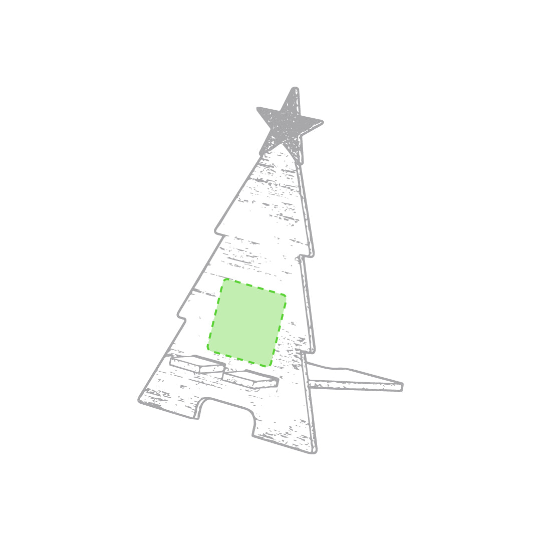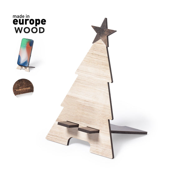 Smartphone holder with Christmas tree design, made of natural wood and original bicolor finish. Easy to assemble and with Made In Europe logo.