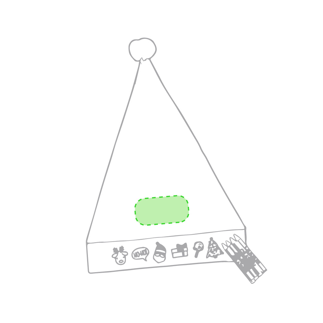Santa Claus hat for children. Front strip of non-woven in white color with cheerful drawings and especially designed to be colored with crayons. Includes 4 cylindrical body crayons in varied colors.