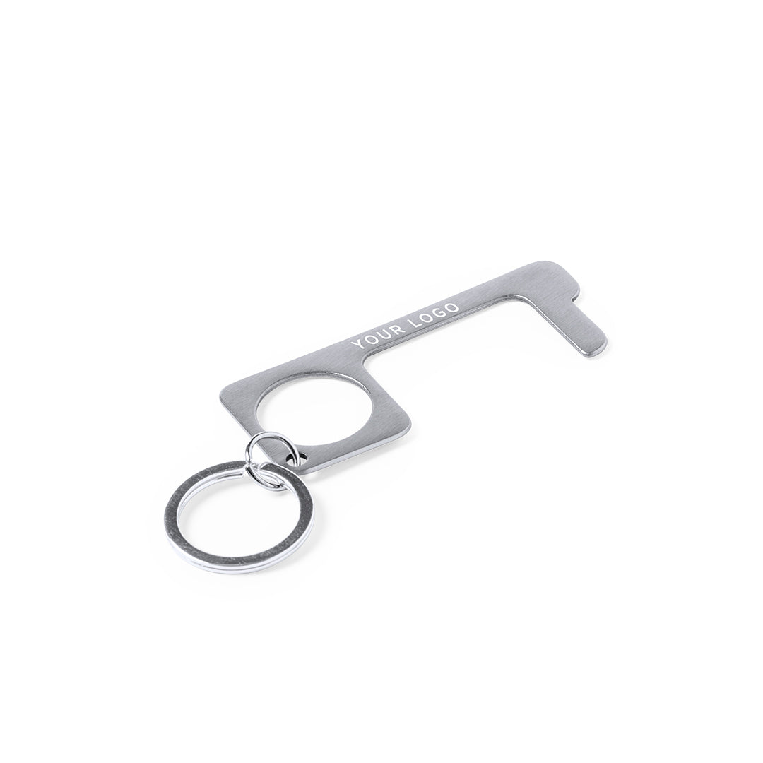 Hygienic, anti-contact safety key ring, made of resistant stainless steel. Specially designed to avoid touching public usage surfaces with your hands (door handles, switches, public use taps, ATMs…). With comfortable cut-out for the finger and presented in an individual bag. Recommended for laser printing.