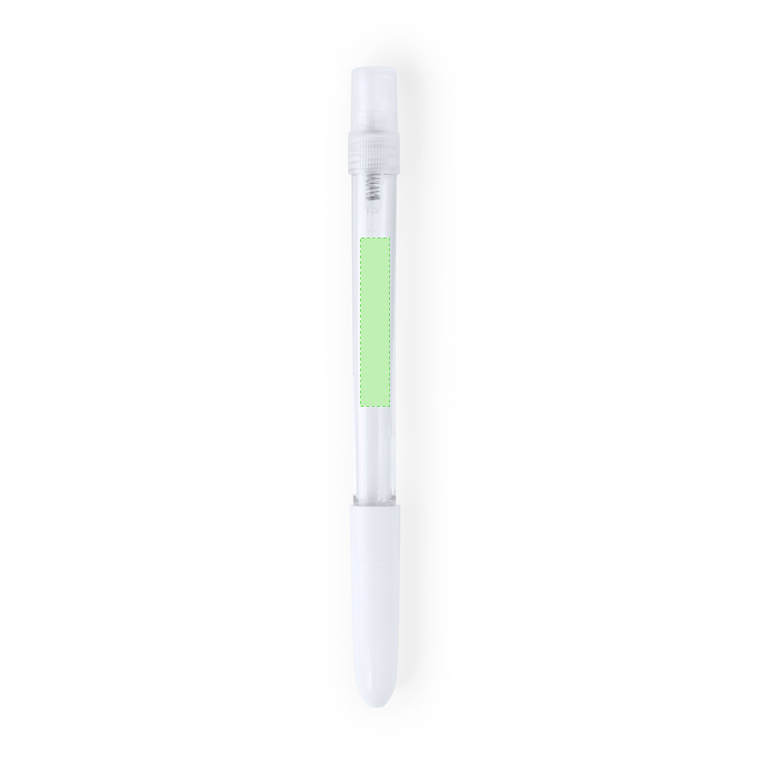 Sterilizer pen with rechargeable sprayer and protective hood. Made of resistant ABS with shiny finish. Blue ink. Sprayer capacity 10 ml. Liquid not included. Avaiable in white colour.