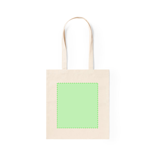 Bag made in cotton, natural finish and 280g/m2. Stitched finish and long reinforced handles (70 x 2.5 cm). Resistance up to 10 kg in weight.