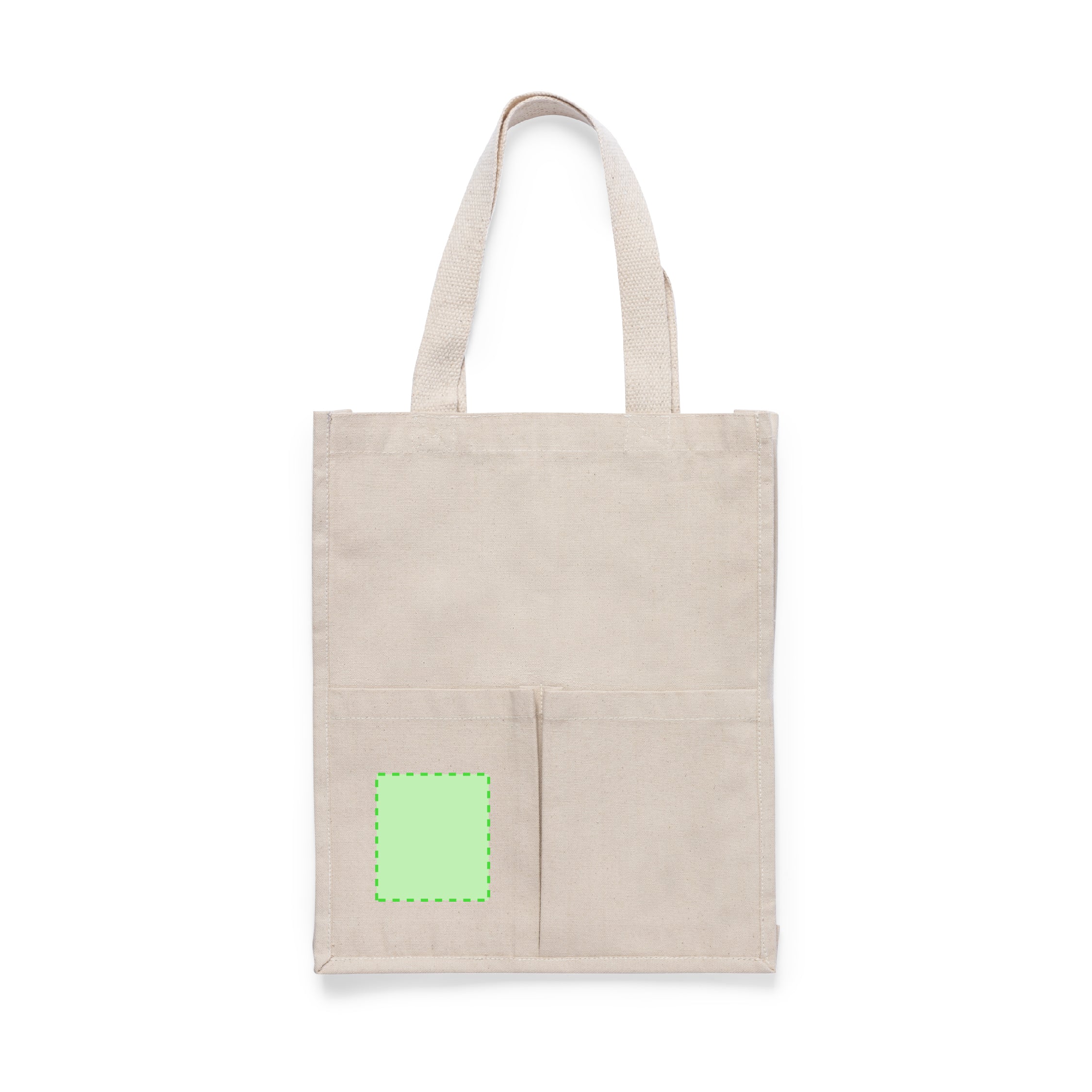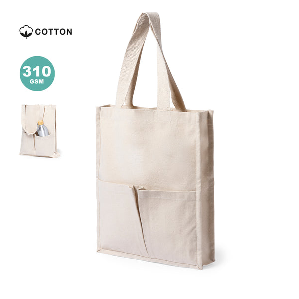 Bag made of cotton, natural finish and extra weight of 310g/m2. With two outside pockets, stitched finish and with gusset. Extra wide and reinforced medium handles (58 x 3.5 cm). Resistance up to 10 kg in weight.