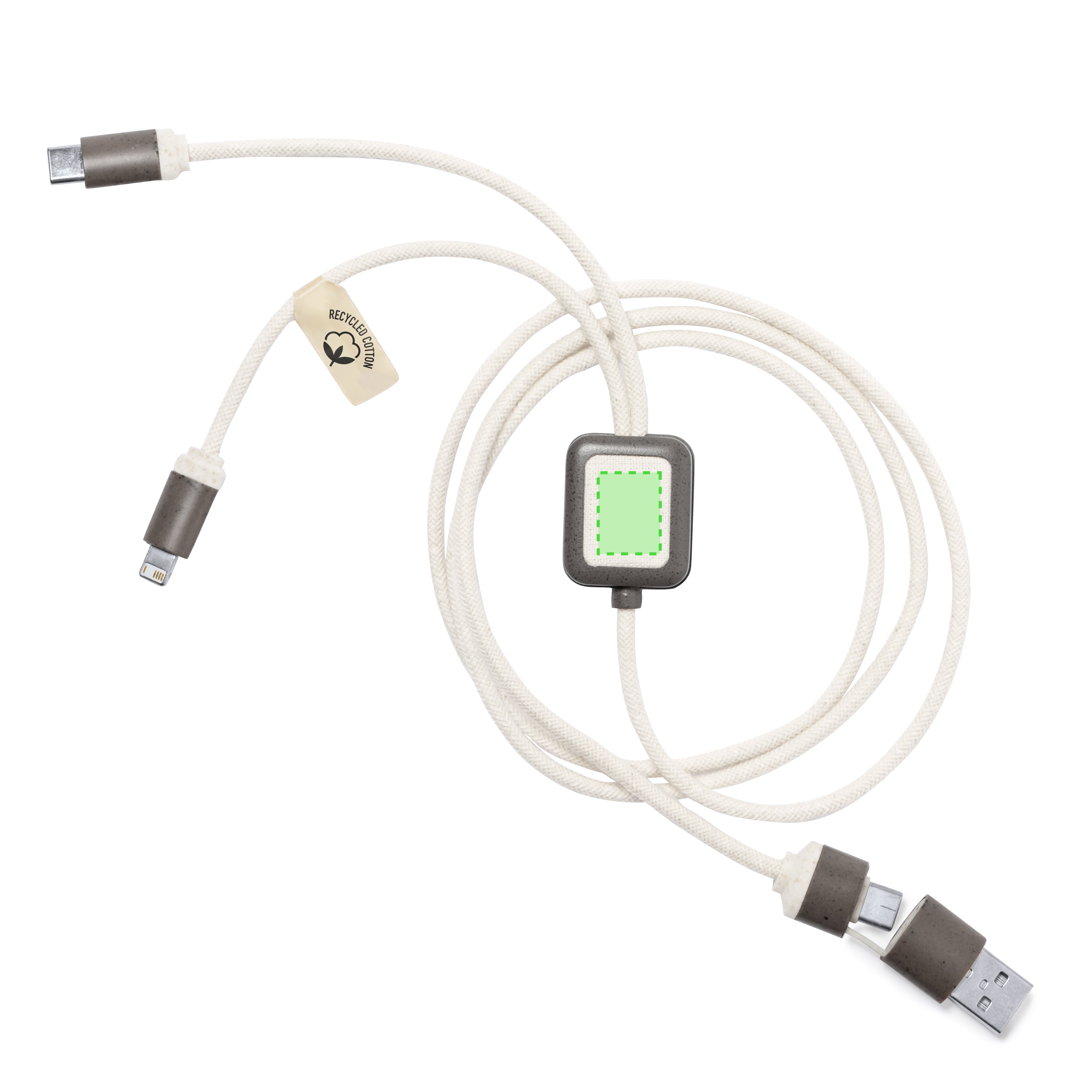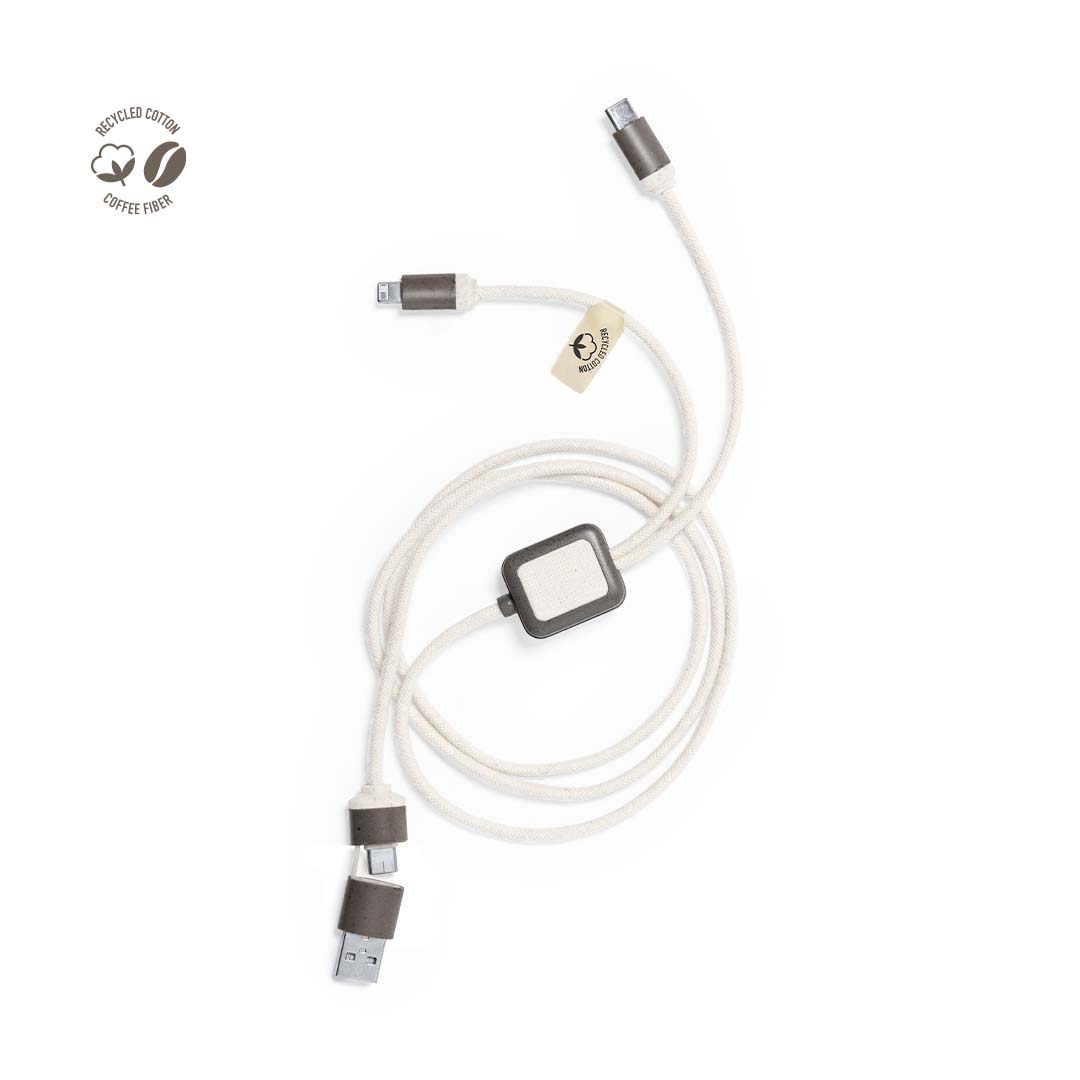 Charging cable made of coffee fibre, with cables covered in recycled cotton. Type C and USB input connections, with Type C, Lightning and Micro USB outputs. 5V DC 2.4A. With coffee fibre and recycled cotton logo. Presented in an individual kraft design self-seal bag.Coffee fibre is a circular solution that is obtained from the use of the waste produced in the production of coffee. A sustainable alternative that favours the reduction of the use of plastics, saving energy in its manufacturing process and contributing to the care of the environment. GRS (Global Recycled Standard) certification is available, which guarantees the recycled origin of the material used to manufacture the product.