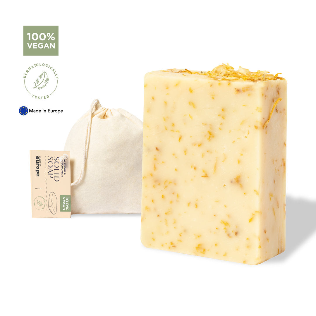 Vegan soap bar of 100 gr. Calendula and camomile scent with soothing, moisturizing and repairing properties. Dermatologically tested and manufactured in Europe. Presented in an individual cotton bag, with drawstring closure and a distinctive label. Sustainable and 100% vegan product, with no animal ingredients. No tests have been carried out on these products on animals, promoting the protection and respect for all animals.