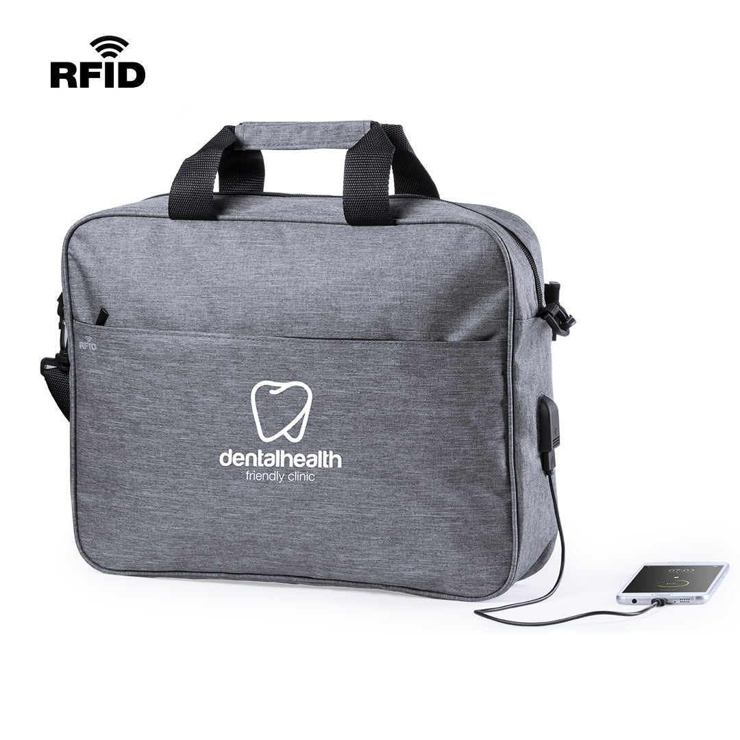 Security document bag in an urban design and in resistant 300D polyester material. Inside pocket with RFID (Radio Frequency Identification) security technology that keeps card and other devices data safe. Protected handles and main compartment with zipper closure. With USB connection -powerbank not included and inside, padded pockets for laptops up to 15 inches and tablets up to 10 inches. Adjustable shoulder strap with padded protection.