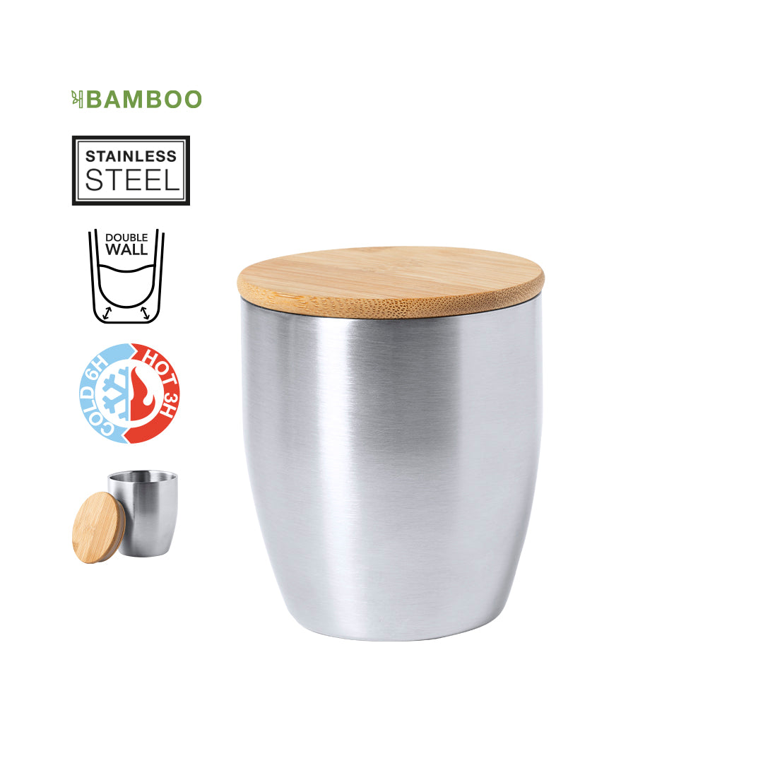 Stainless steel thermal cup, with double wall and 280ml capacity. Lid made of bamboo and presented in an attractive eco-design box.