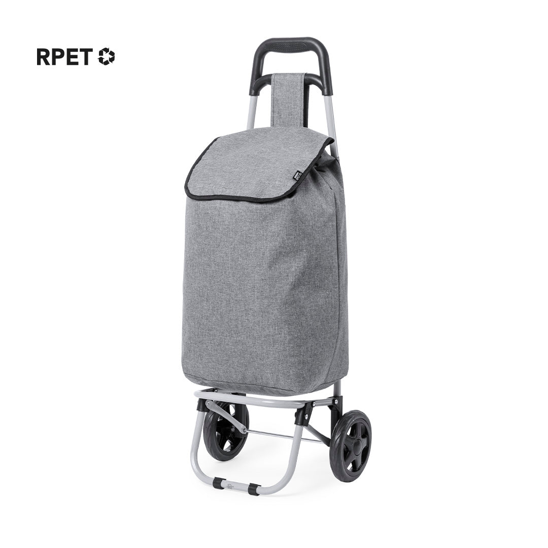 Nature line, foldable shopping trolley.Made of resistant 600D RPET polyester, made from recycled plastic, in order to encourage the reuse of plastic waste and thus help the sustainability of the planet. With reinforced handle, tubular metal body, rear zip pocket and rubber protection pads. High quality, reinforced wheels, with RPET emblem on the flap.