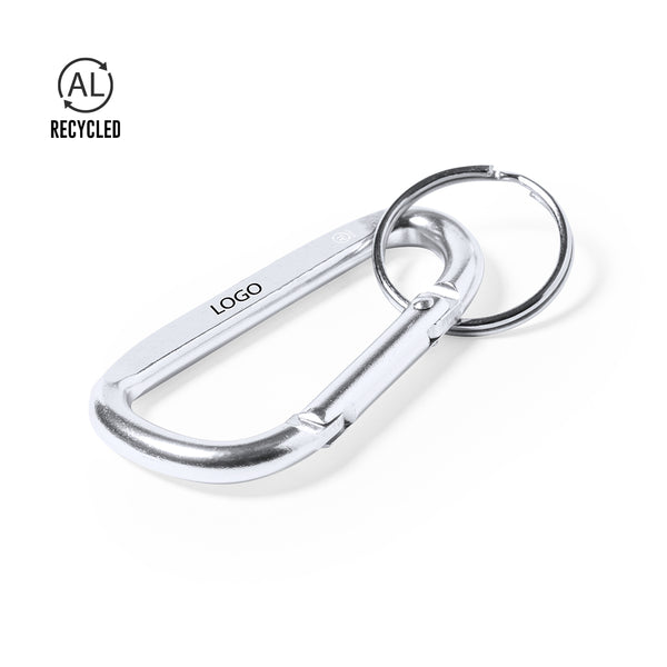 Recycled aluminium carabiner with silver finish. With matching metal ring and the recycled aluminium distinctive. Recycled aluminium is a material with almost infinite recycling possibilities, with no loss of its original properties and less energy consumption in the process.