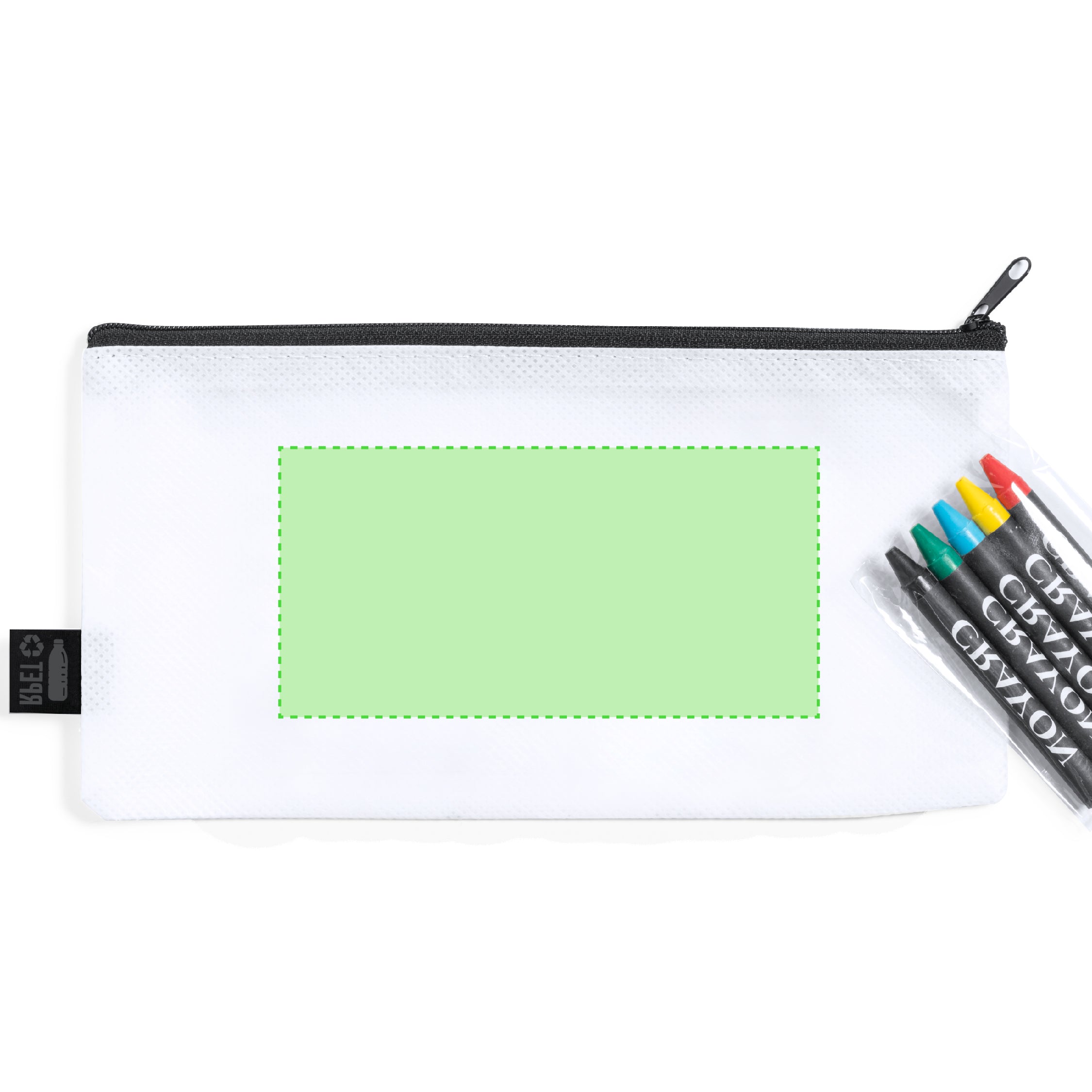 Case made of non-woven RPET in white, with zip closure and metal puller. Specially designed for coloring with crayons. Including 5 crayons in different colors. Outside label with the RPET distinctive.