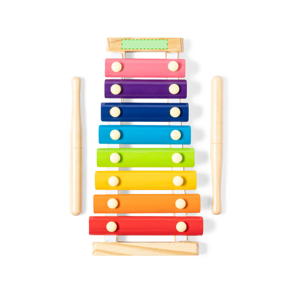 Xylophone with base and drumsticks in natural pine wood. Multicoloured metal keys and presented in an individual box with kraft design.