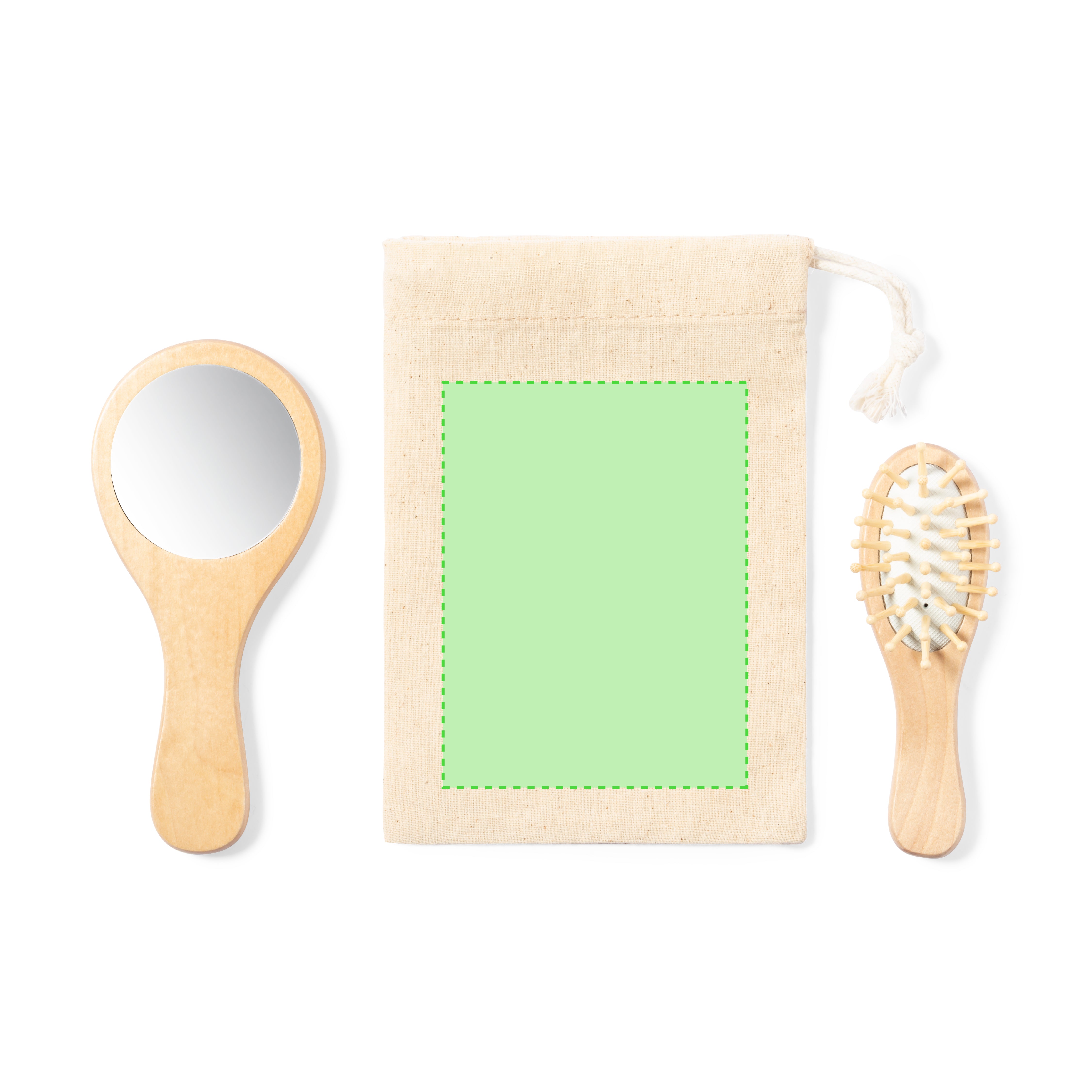 Set of mirror and brush, made in natural wood. Presented in a cotton pouch with drawstring closure.