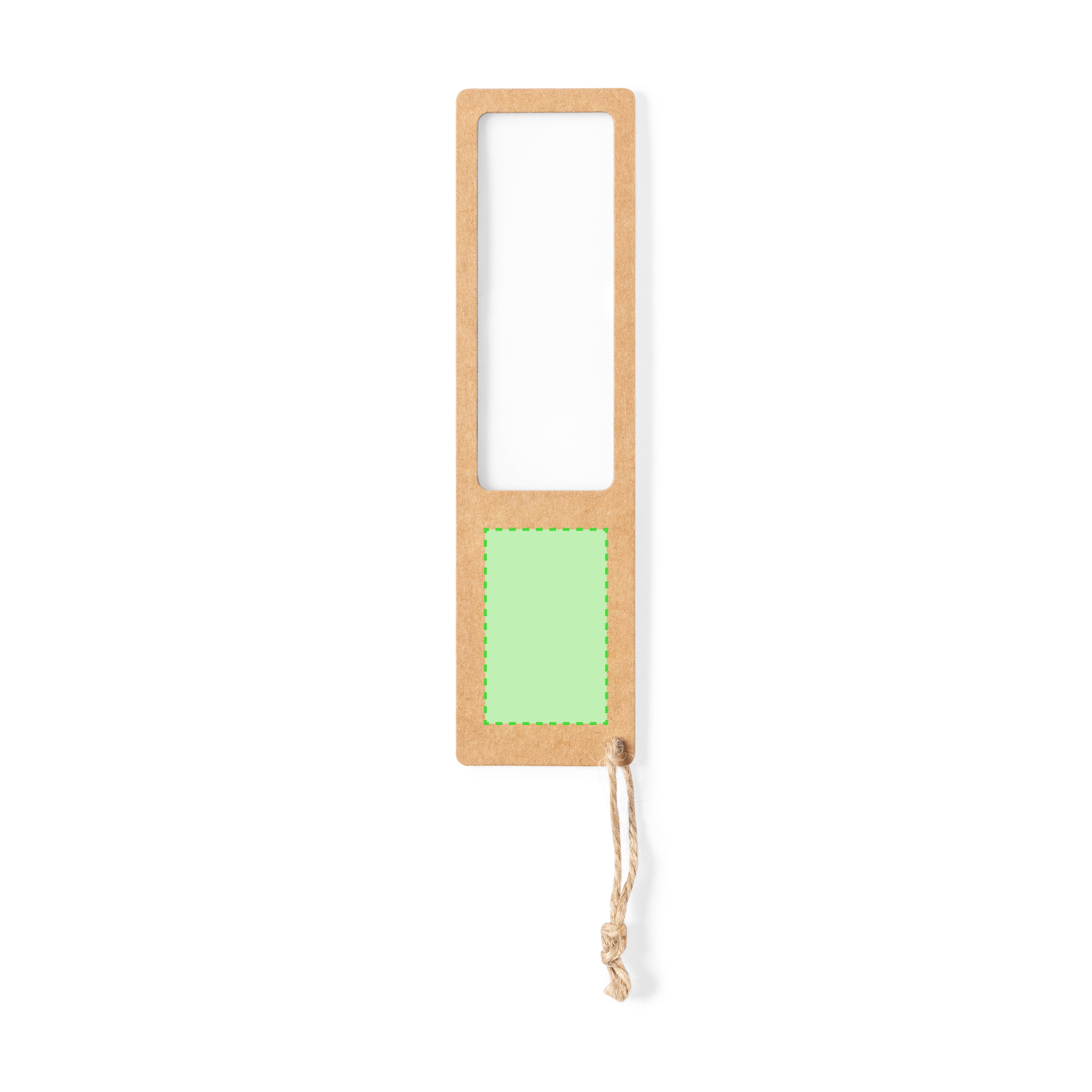 Nature line bookmark with integrated 3X magnifier. Made of recycled cardboard, with large printing area and matching carrying strap.