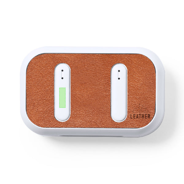 Bluetooth® earphones, made of RABS and in stylish white color, with the lid of the charging base lined in recycled leather.Bluetooth® 5.1 connection, hands-free function and 30 mAh battery. Ergonomically designed, with integrated touch control button on each earpiece and LED charging status light. Matching charging base with 300mAh battery. Including Type C charger cable and instruction manual in English and Spanish. Presented in an individual kraft design box.RABS or Recycled ABS material and recycled leather come from the recycling of items at the end of their lifespan. The recycled materials used include RCS certification, which guarantees their recycled origin.