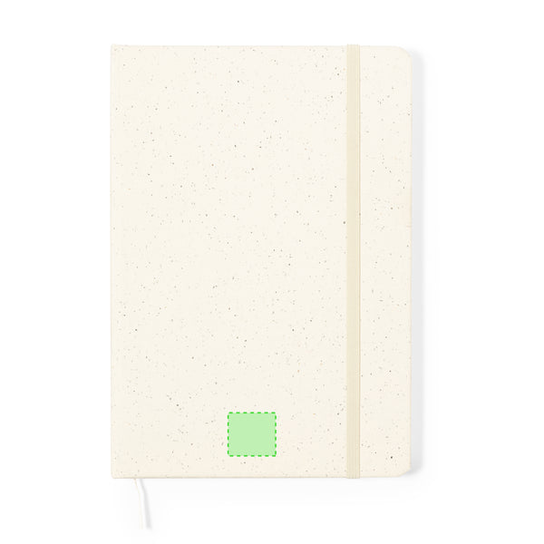 A5 notepad with hard cover in strong recycled cardboard. With 100 white sheets and elastic band for closing. Presented in an individual recycled bag.