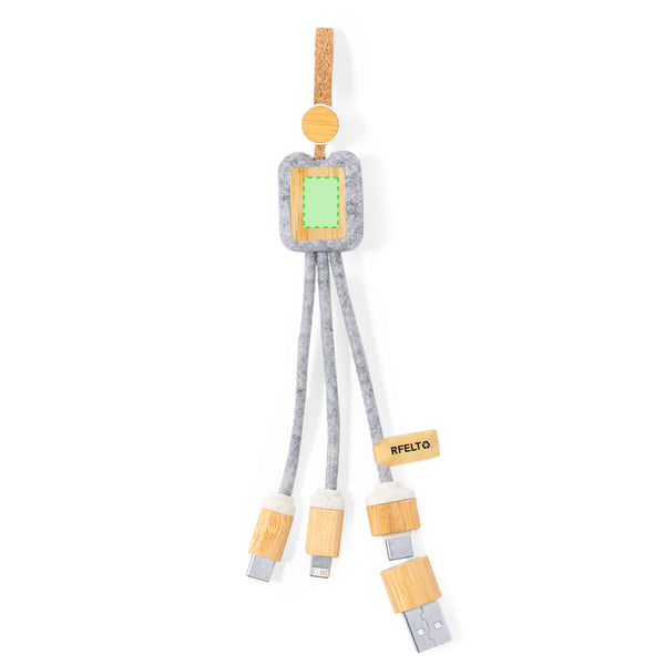 Charging cable made of bamboo and RPET felt. With Type-C and USB input connections and Type-C, lightning and Micro USB outputs. 5V DC 2.4A. Presented in an individual kraft design self-sealing bag, with distinctive label.Recycled RPET felt is the result of the combination of the recycling processes of plastic materials along with the millenary technique of felt manufacturing, resulting in an eco-trend material that, in addition to being of recycled origin, also becomes recyclable.
