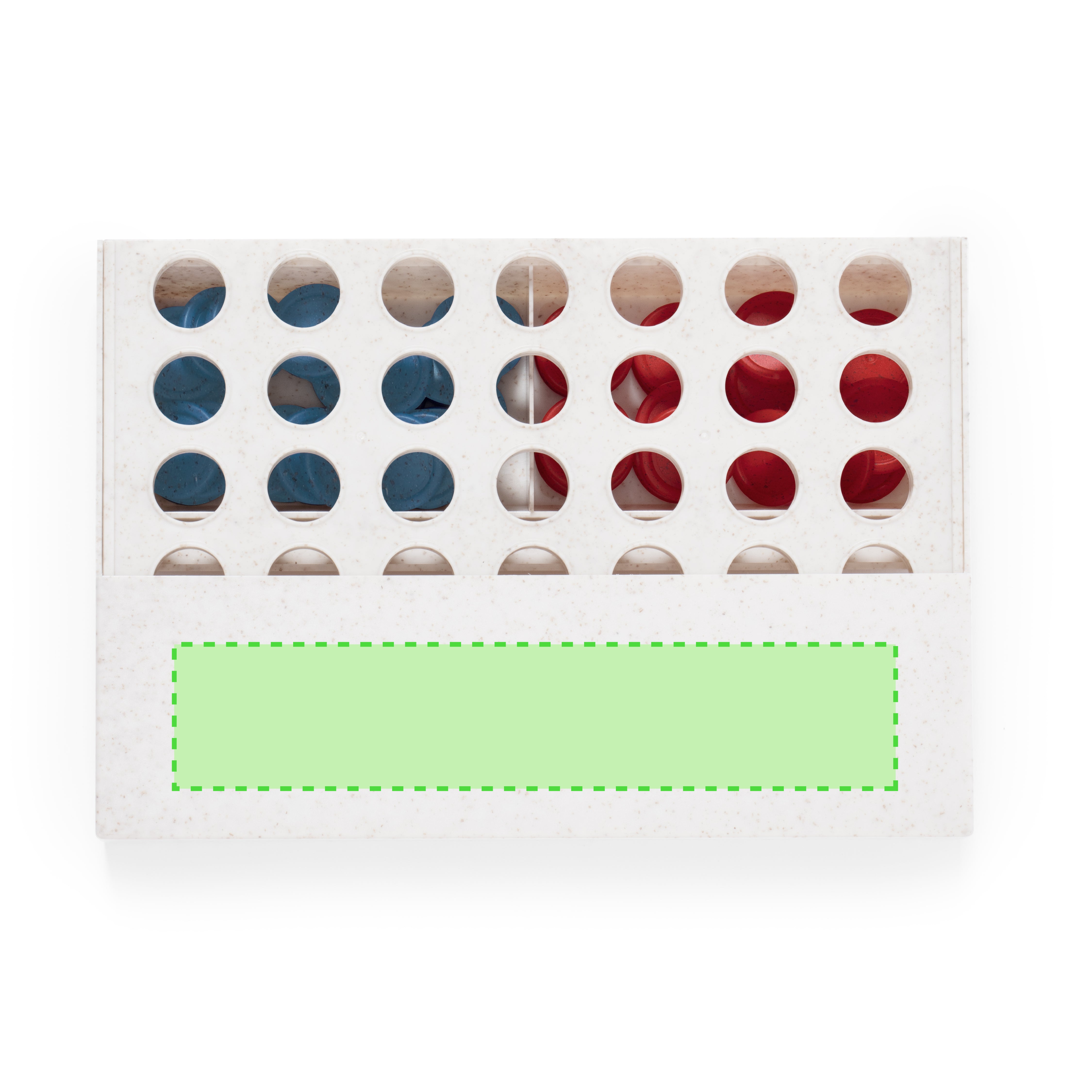 Fun board game made of wheat straw. Composed of a vertical board and 42 circular pieces (21 red and 21 blue). Exciting for all ages by inserting the pieces through the slots to get 4 pieces in 1 row. Easy to assemble thanks to its mobile board that can be unfolded or folded. Presented in a kraft design box.
