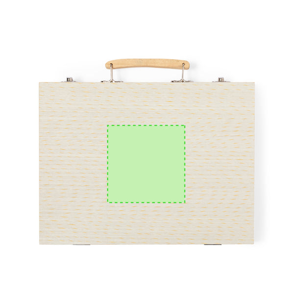 Complete colouring case made of wood, with convenient carrying handle. Contains: - 12 markers- 12 pencils- 12 crayons - 12 oil crayons - Watercolour plate with brush and palette - Pencil sharpener- Eraser- Glue pot- Ruler