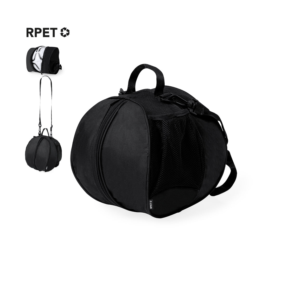 Useful bag for balls, made in RPET. With a central compartment for storing a ball and with zipper closure. Very easy to carry using the handles or the shoulder strap. It also has two side mesh pockets and an RPET label.RPET material is made from recycled plastic, thus promoting the reuse of plastic waste and helping the sustainability of the planet.