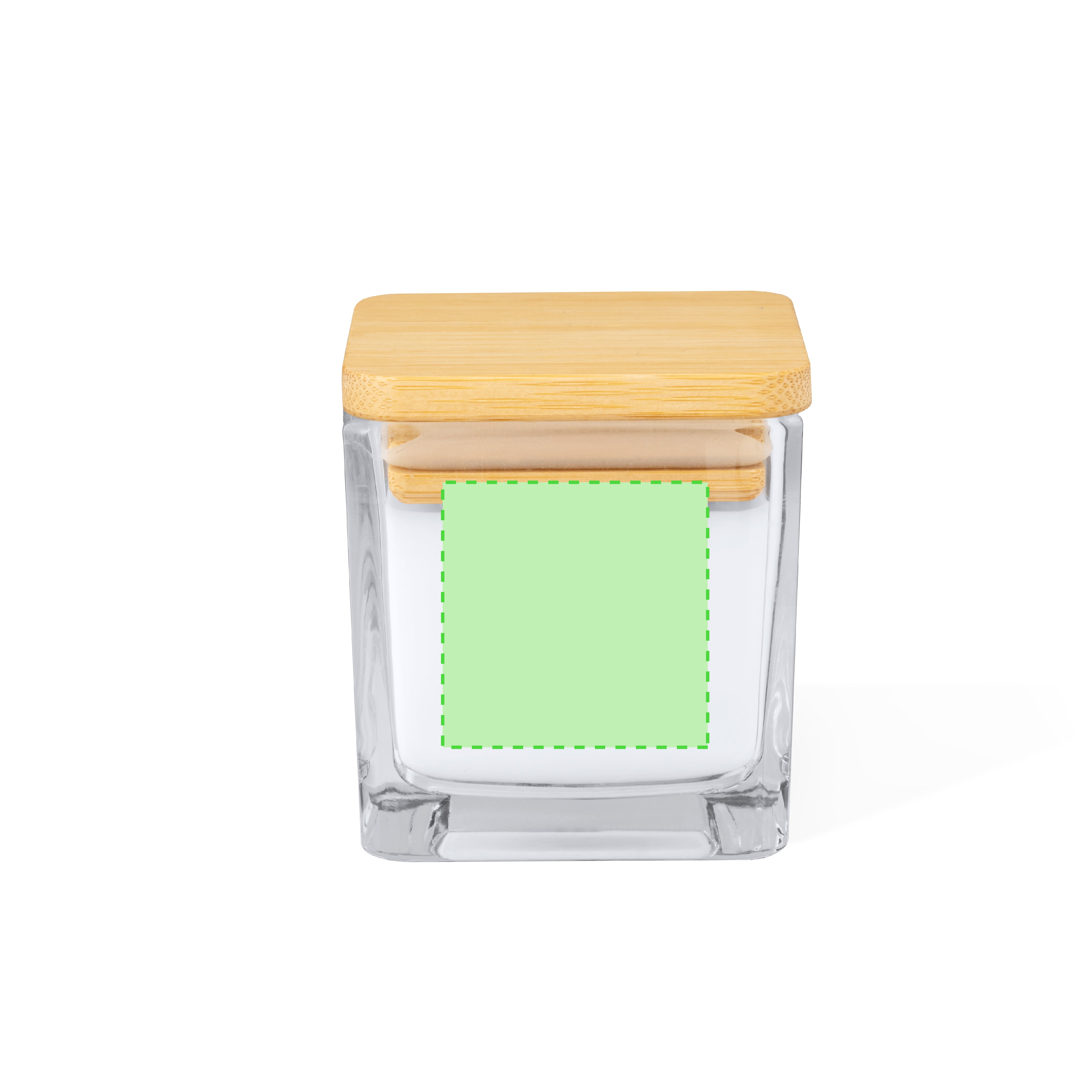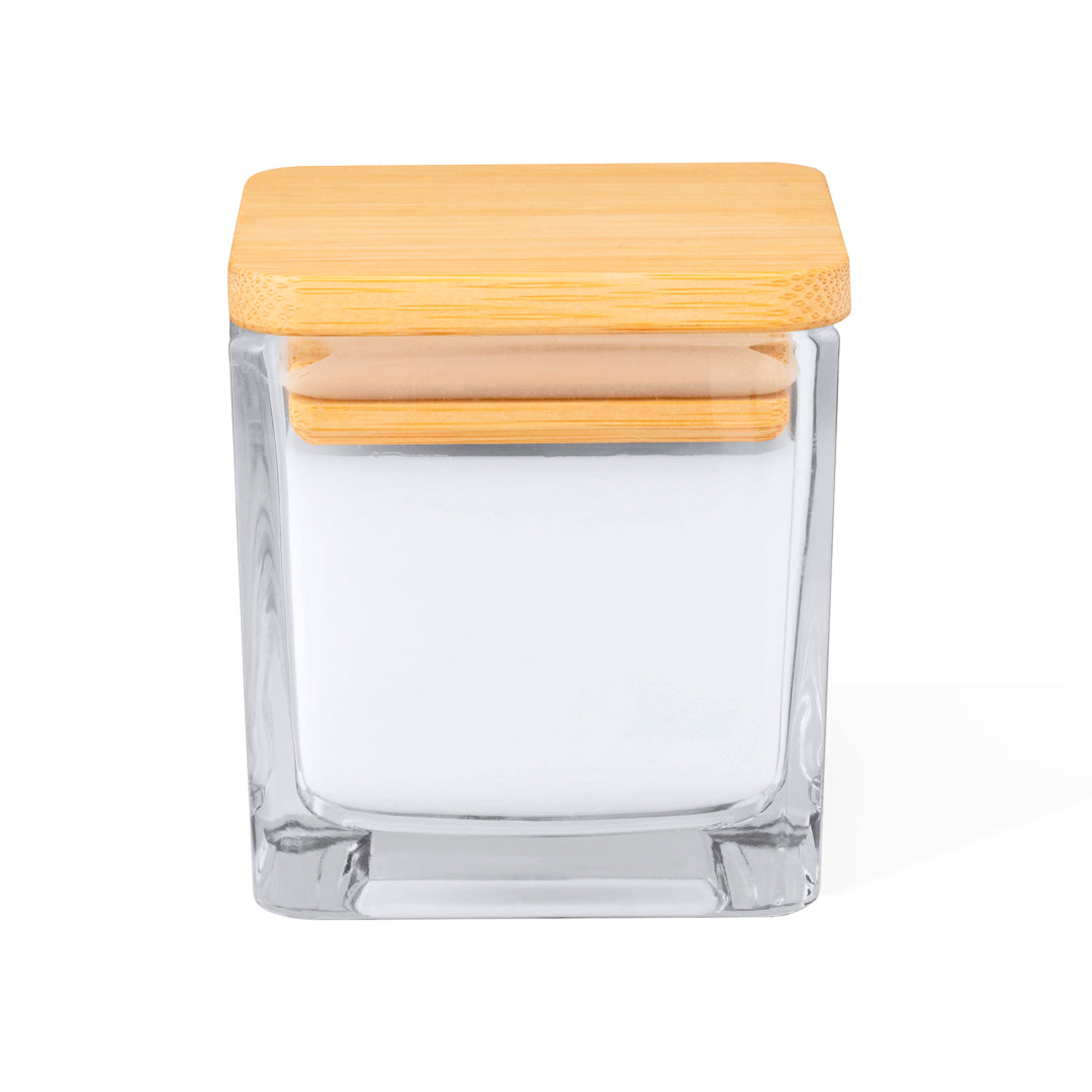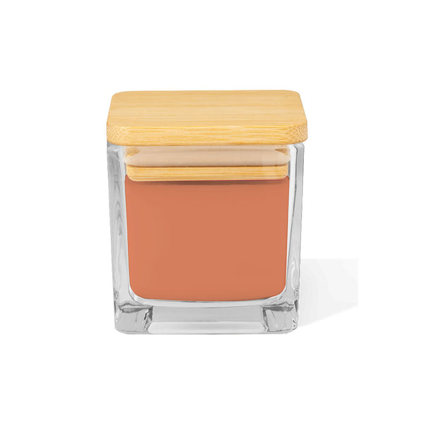 Scented candle in a transparent glass jar, square-shaped with a bamboo lid. Available in various fragrances: