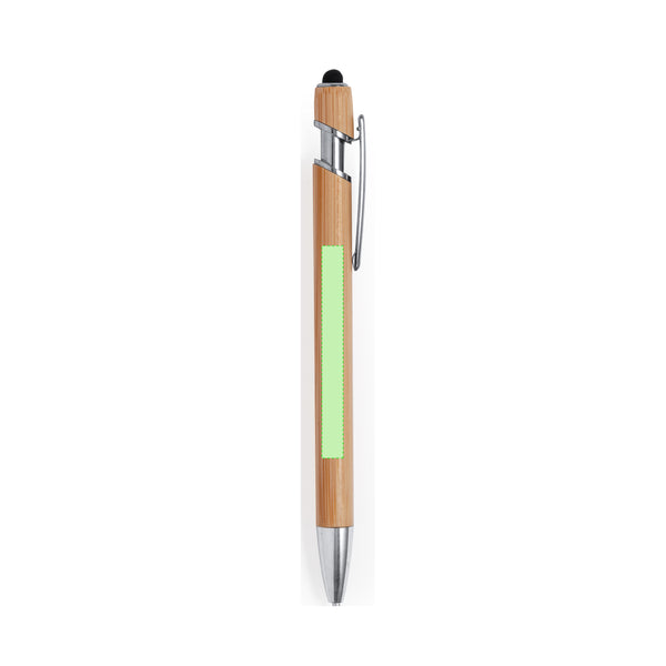 Push-button mechanism ball pen pointer with bamboo barrel, chrome plated fittings and black pointer. Metal clip and blue ink.Materials such as bamboo promote the use of natural raw materials, thus reducing pollutant emissions. It comes from a highly resistant and versatile plant, with rapid growth and regeneration, making it an excellent alternative to the use of traditional wood.