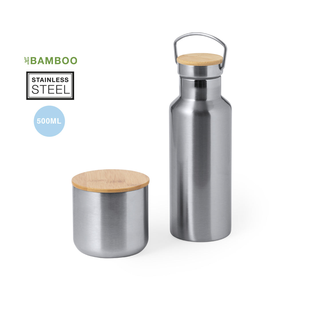 Useful set of thermos flask and thermal tumbler in stainless steel. Including 500 ml capacity stainless steel thermos flask, with safety screw cap, bamboo base and carrying handle. Also comes with a 300 ml capacity stainless steel tumbler with bamboo lid and push-on closure. Presented in a kraft design box.