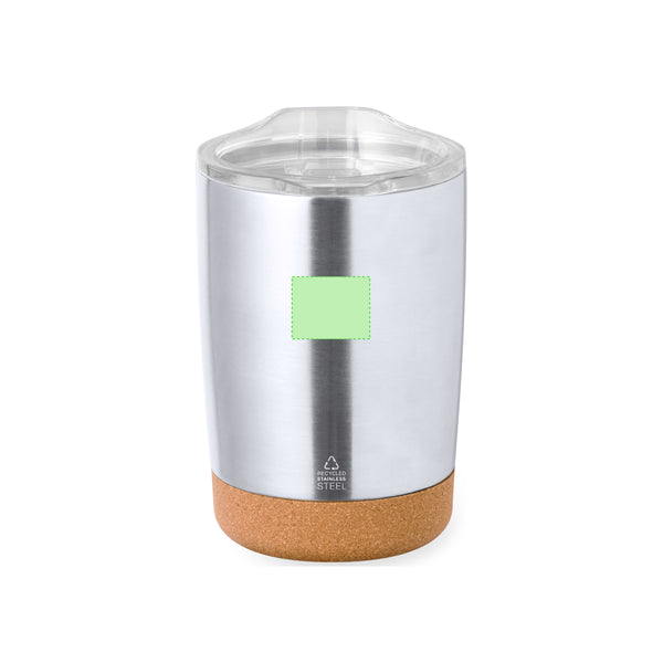 Tabletop cup made of recycled stainless steel with a capacity of 350 ml. Combination of natural cork base with recycled stainless steel body in silver finish. With double wall for better and more durable temperature preservation. Original transparent measuring cap with easy-opener, and Recycled Stainless Steel logo. It is ideal for your desk, table, or any surface where you can enjoy your favorite drink.Steel is one of the most sought-after materials and can be found almost everywhere, from everyday products to large constructions. It has countless properties, including durability and a high degree of reusability, making it a highly valued alternative for sustainable solutions. Properly treated, it allows new resources of infinite use to be obtained