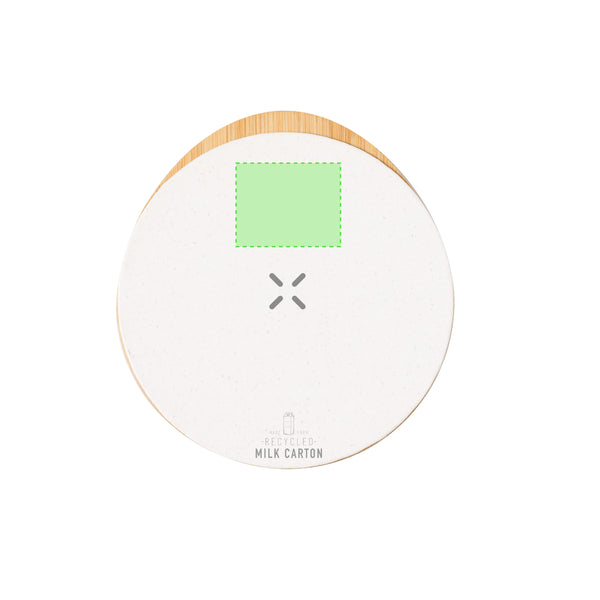 Wireless charger 15W of circular shape. With charging surface in recycled material from milk cartons,and base made of bamboo, compatible with devices equipped with Qi wireless charging technology. Type C charger cable included, with logo recycled milk cartons in charging station. Non-slip bamboo base and presented in an individual box with kraft design. Instructions manual in English and Spanish.Milk cartons are mostly made of cardboard and aluminum. During the recycling process, the different packaging materials are separated for reuse and re-purposing, thus contributing to the infinite path of the circular economy. This material is well known for its high recyclability, as well as for its lightweight and resistance.Materials such as bamboo encourage the use of natural raw materials, reducing pollutant emissions. It comes from a highly resistant and versatile plant with rapid growth and regeneration, making of it an excellent alternative to traditional wood.Manufactured according to RoHS standards and in compliance with the following safety requirements: Overheating protection system. Over-charge protection system. Blocking system to prevent short circuits.