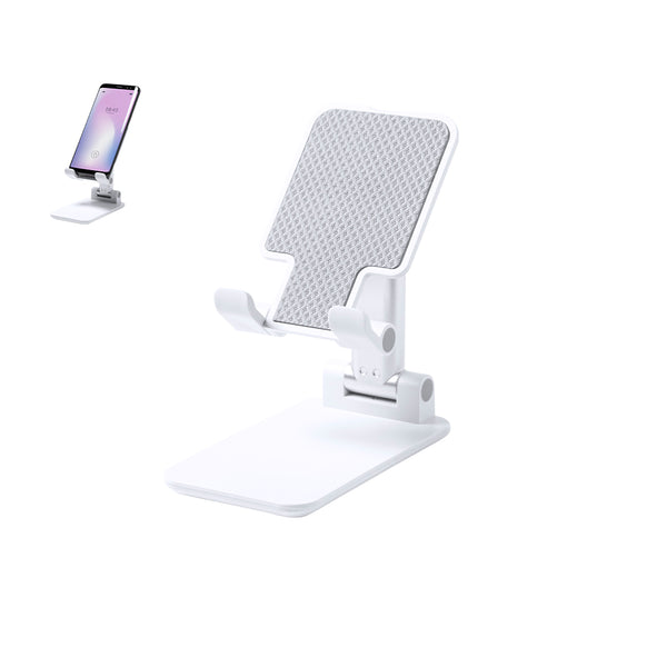 Foldable holder for smartphones and tablets. Adjustable in height, including non-slip rubber protections at the base and holder. In a stylish white finish, with a wide branding surface, especially recommended for pad printing. Presented in an attractive design box.